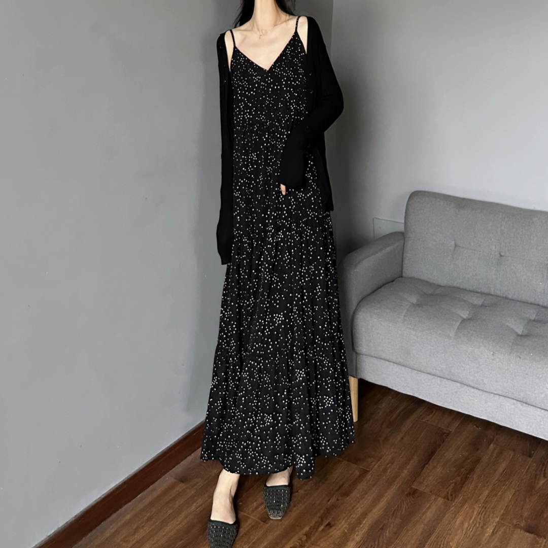 孕妇遮肚显瘦连衣裙 休闲外穿圆点长裙 黑白小波点吊带裙 宽松大码