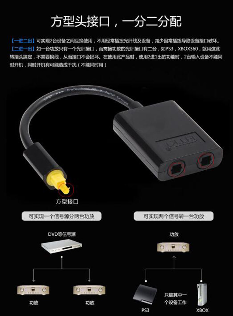 EMK音频光纤分配器1分2 一进二出音频分支器光纤分频器音频切换器