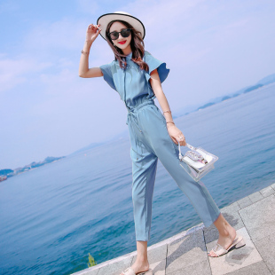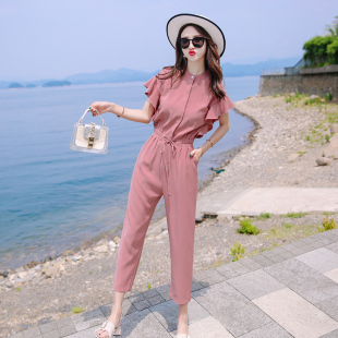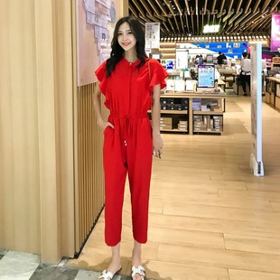 高腰薄款 韩版 工装 雪纺连体裤 九分休闲哈伦连衣裤 时尚 修身 女夏装