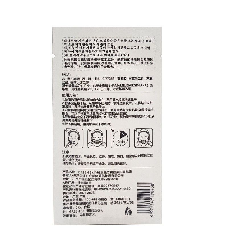吸去黑头男女士清洁毛孔 撕拉式 30片装 格润丝竹炭祛黑头鼻贴鼻膜