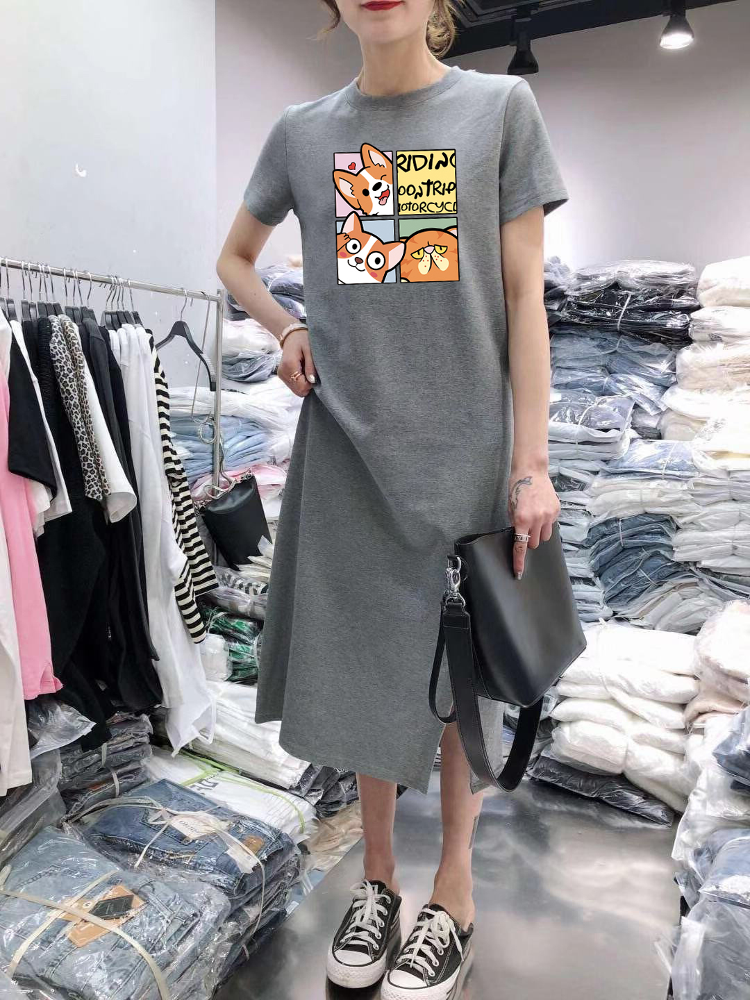 新款 宽松中长款 短袖 休闲遮肚大码 过膝打底T恤裙子 连衣裙女式 夏季