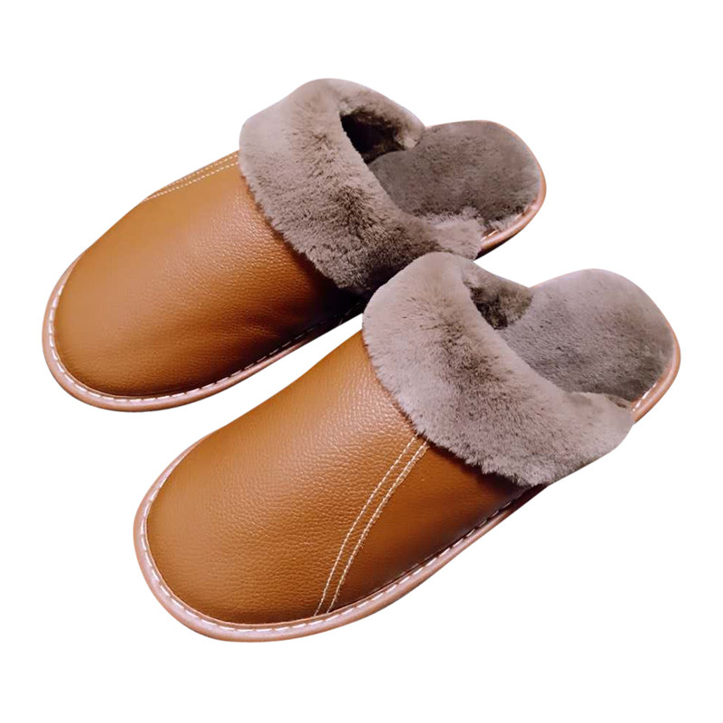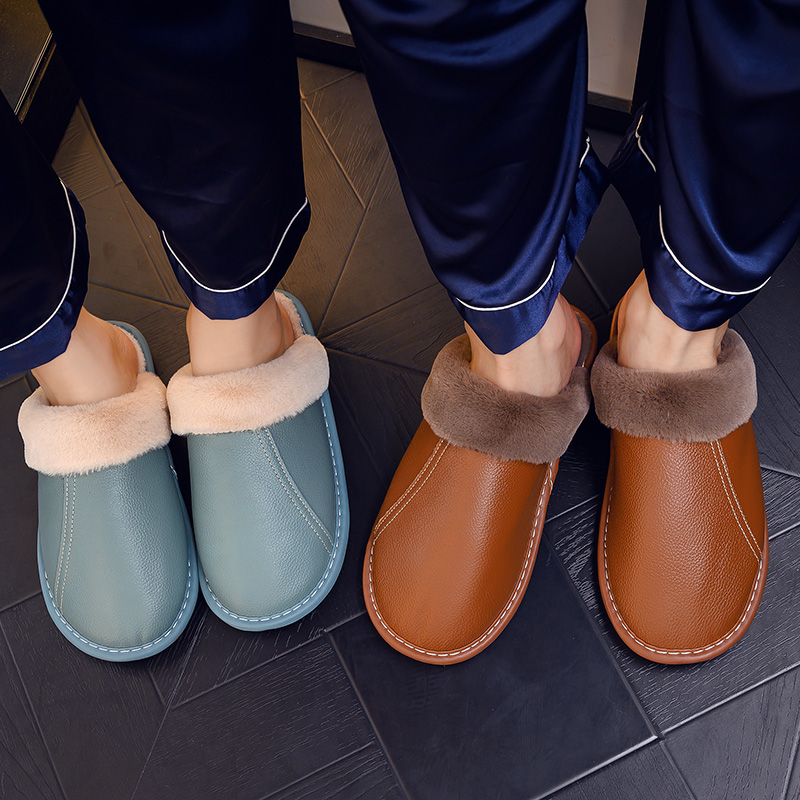 居家全真牛皮防水加厚毛绒秋冬季 男女士防滑静音底家用保暖 棉拖鞋