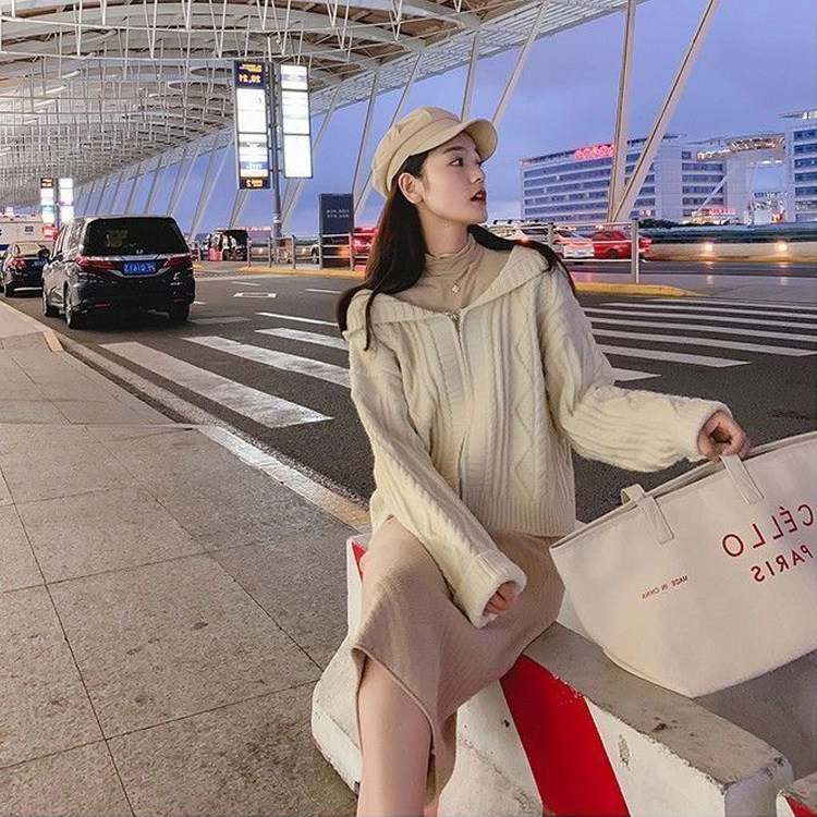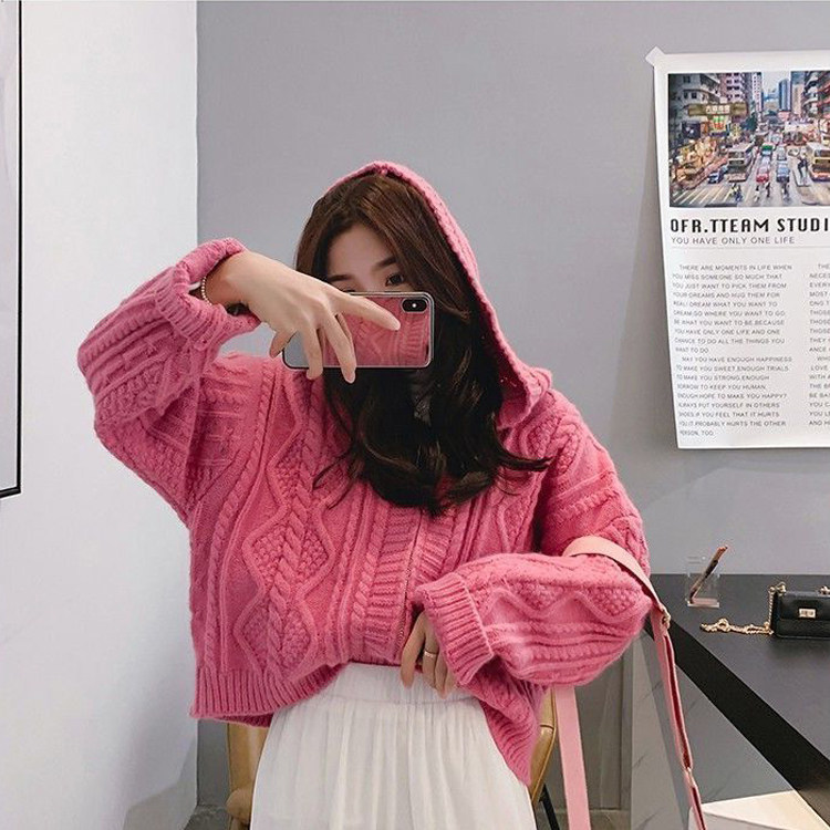 慵懒风宽松麻花拉链针织开衫 连帽毛衣女外套很仙 软妹短款 春秋装