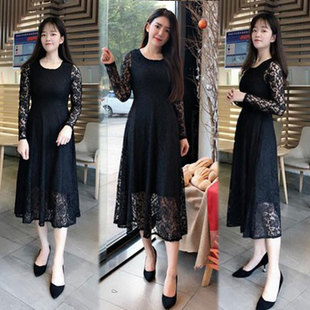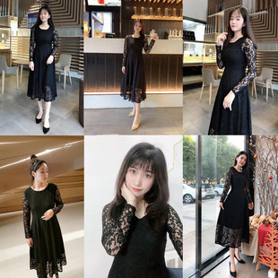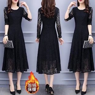 长款 气质大码 加绒打底a字长裙 黑色蕾丝连衣裙女长袖 秋冬2025新款