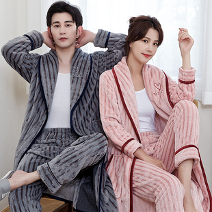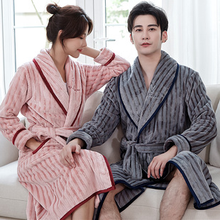 法兰绒家居服睡衣女秋冬加厚加绒保暖冬珊瑚绒睡袍男中长浴袍情侣