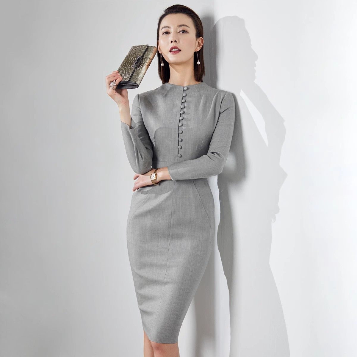 高级优雅OL通勤 收腰显瘦包臀工作正装 颈袖 添香职业连衣裙气质修身