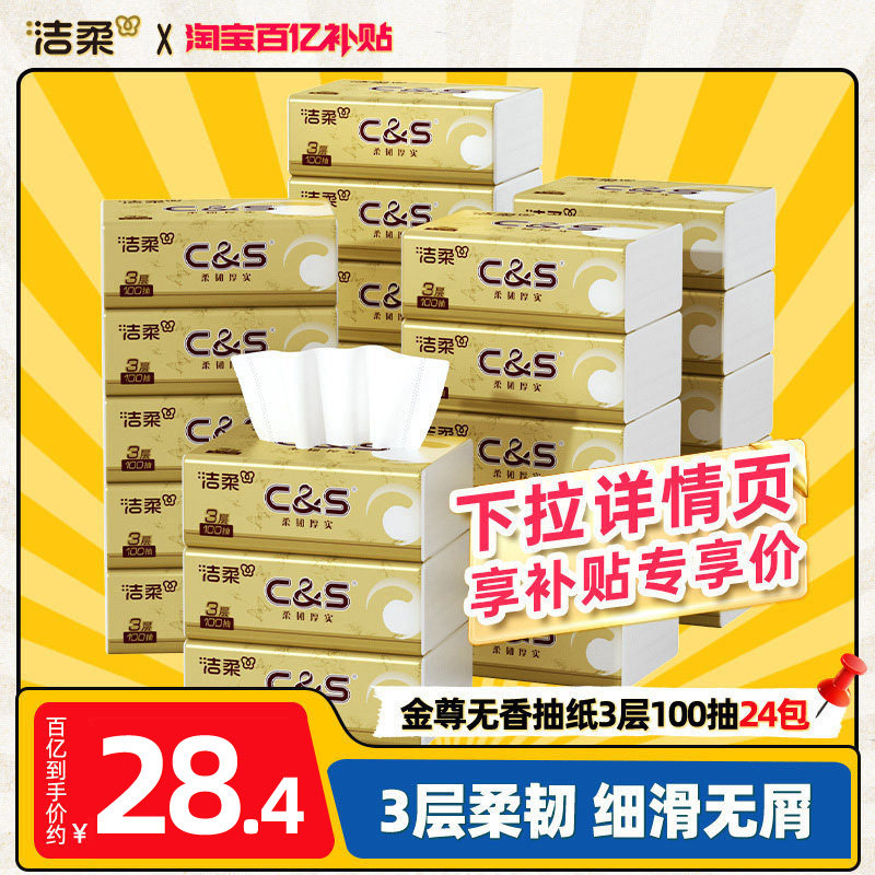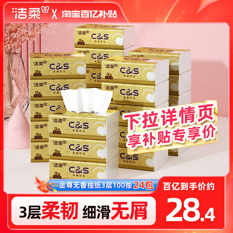 洁柔抽纸金尊无香纸巾3层24包餐巾纸家用100抽实惠装 整箱面巾纸抽