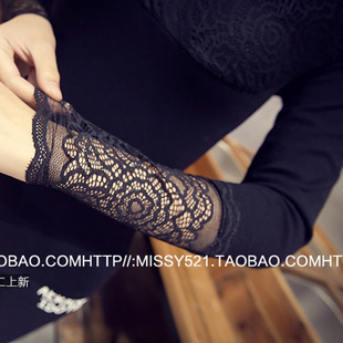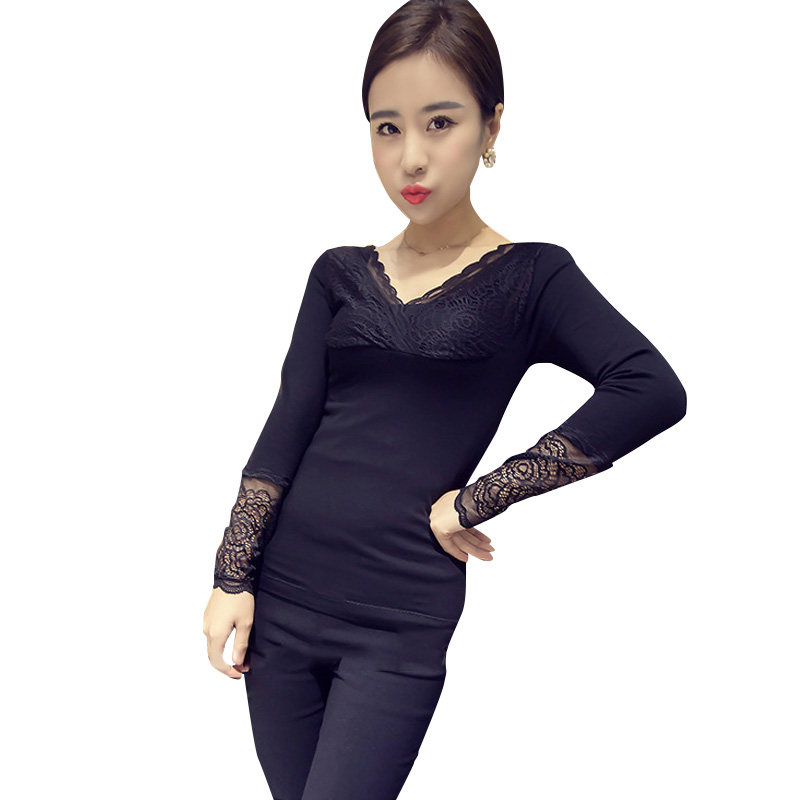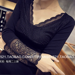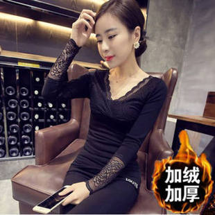紧身蕾丝T恤长袖 女秋冬洋气内搭v领新款 保暖外穿上衣潮 打底衫 薄款