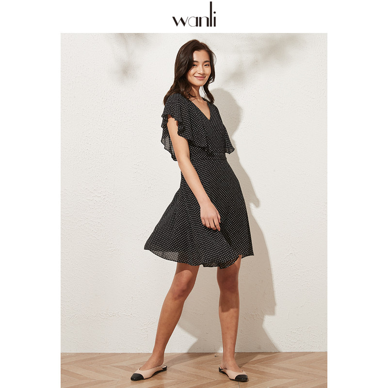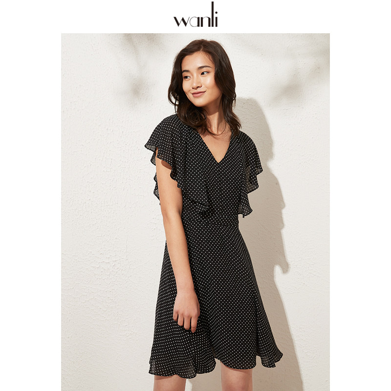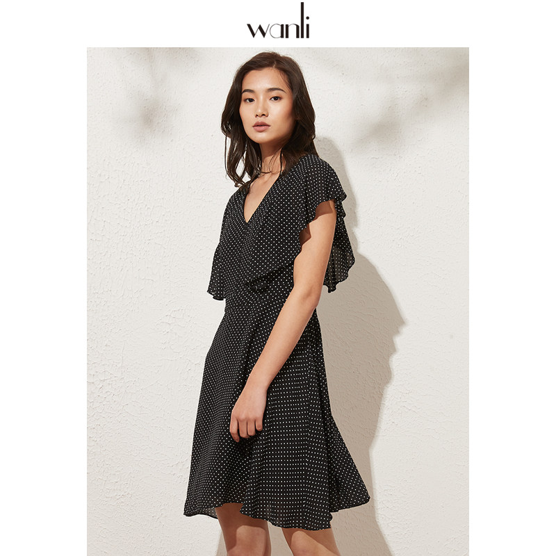 服饰 中长款 女装 女波点碎花荷叶袖 雪纺连衣裙 新款 万丽