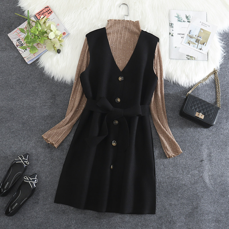 背心裙胖MM复古V领单排扣收腰带毛呢马夹裙女 大码 2020春季 新款