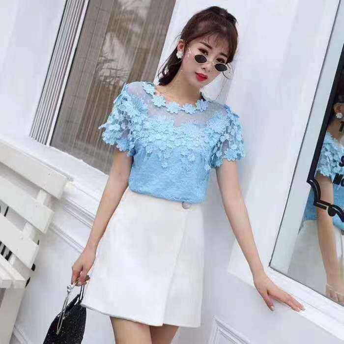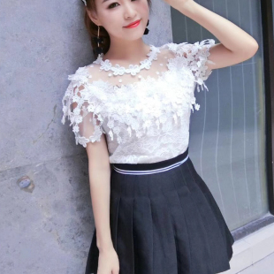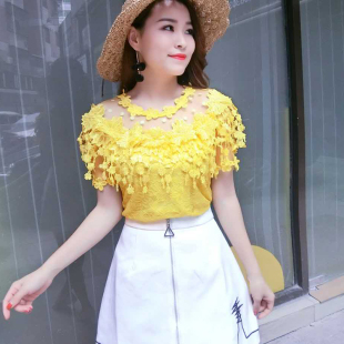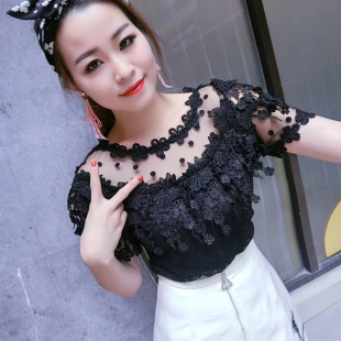女夏装 洋气小衫 新款 花朵流苏镂空露肩性感上衣打底衫 潮 短袖 蕾丝衫