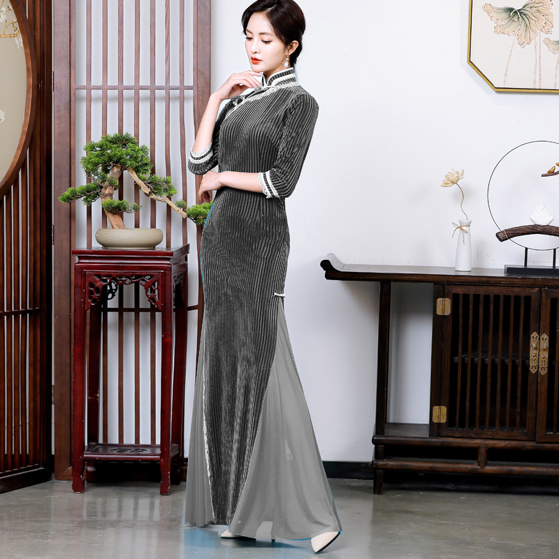 潇夫人自制刺绣腰封鱼尾裙步步生莲丝绒旗袍 加绒 雪后