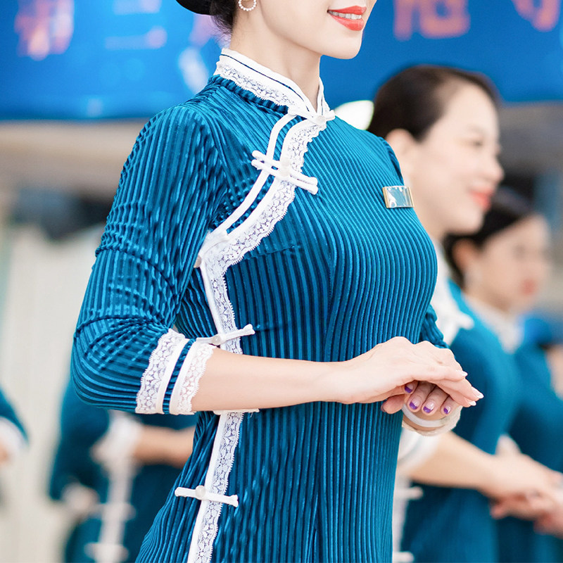 复古日常提花老旗袍 全开襟花盘扣长款 蓝蝶梦 八分水袖 茉茉秋冬新