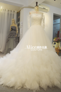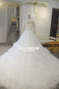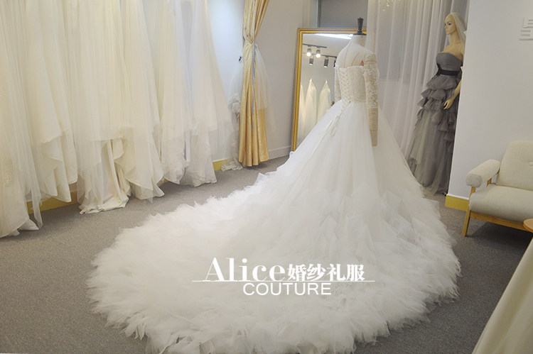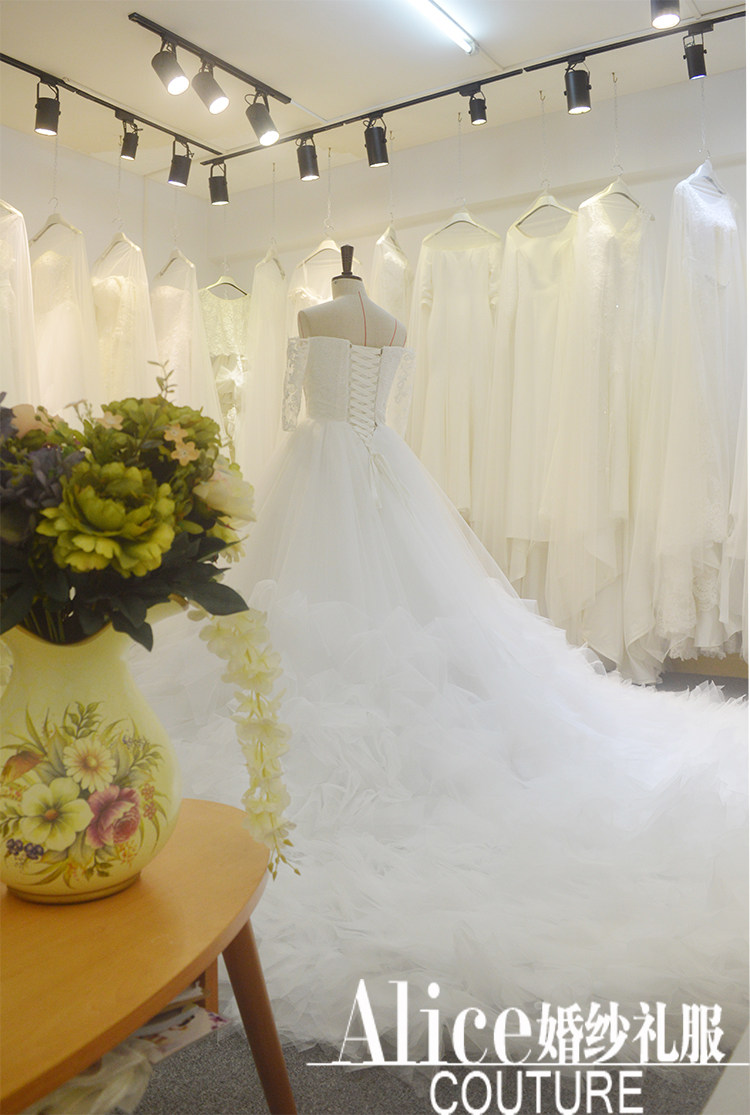 新娘一字肩梦幻羽毛蕾丝小拖尾婚纱新款 孕妇礼服定制 韩高腰大码