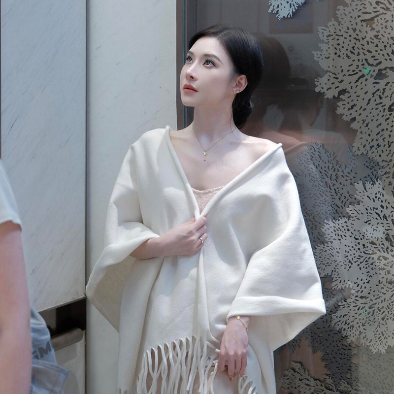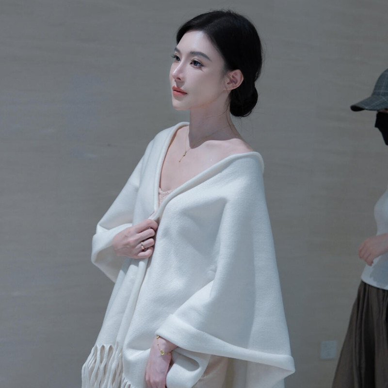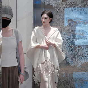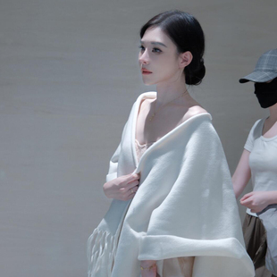 清冷感白色羊毛披肩女外搭2025新款 高级感纯色流苏斗篷披风围巾女