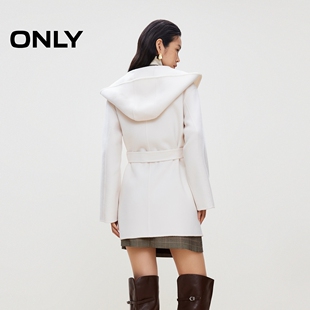 ONLY2025冬季 慵懒风大兜帽斗篷系带绵羊毛双面毛呢大衣外套女 新款