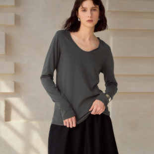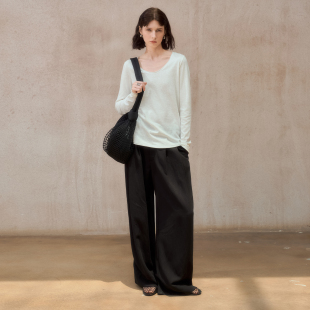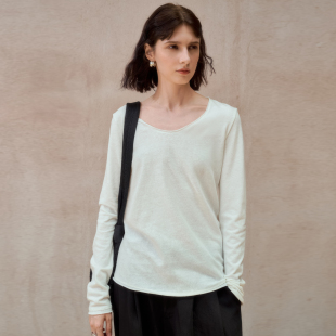25秋冬棉麻打底衫 女百搭上衣宽松白色内搭U领显瘦简约T恤老钱 长袖