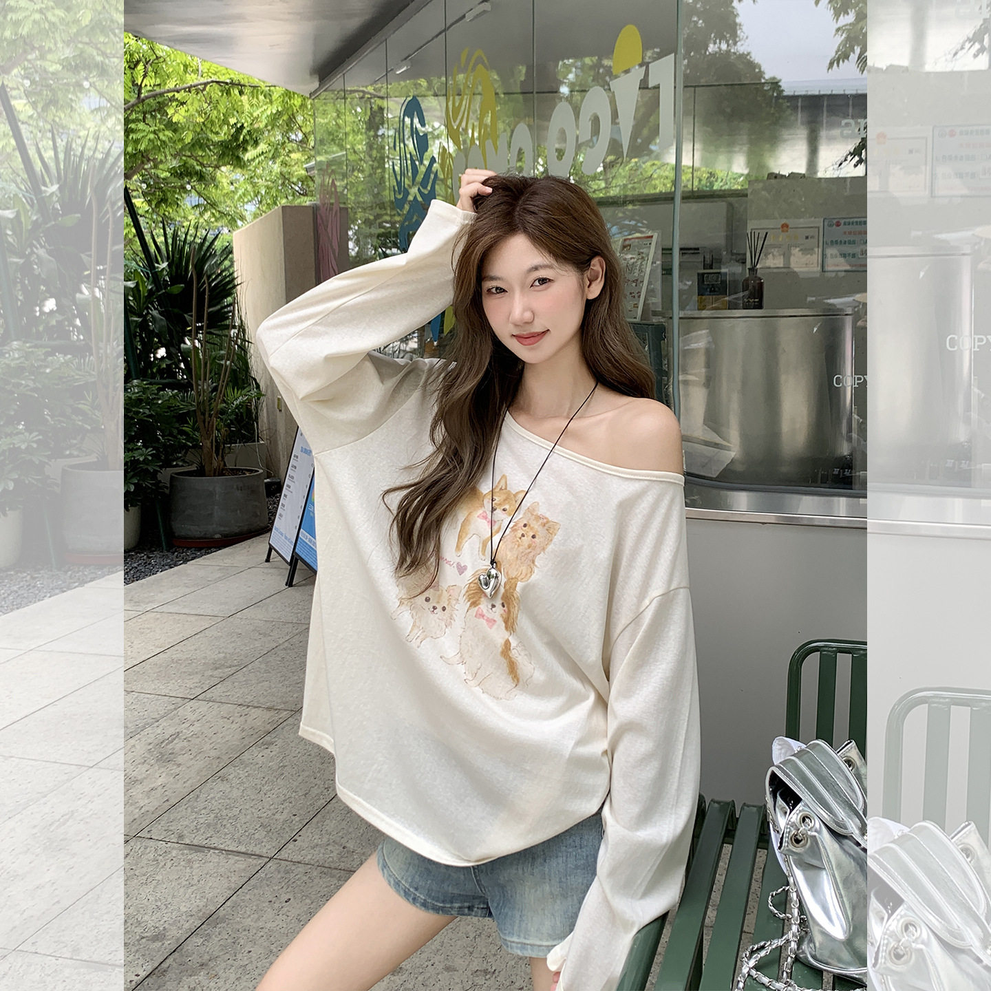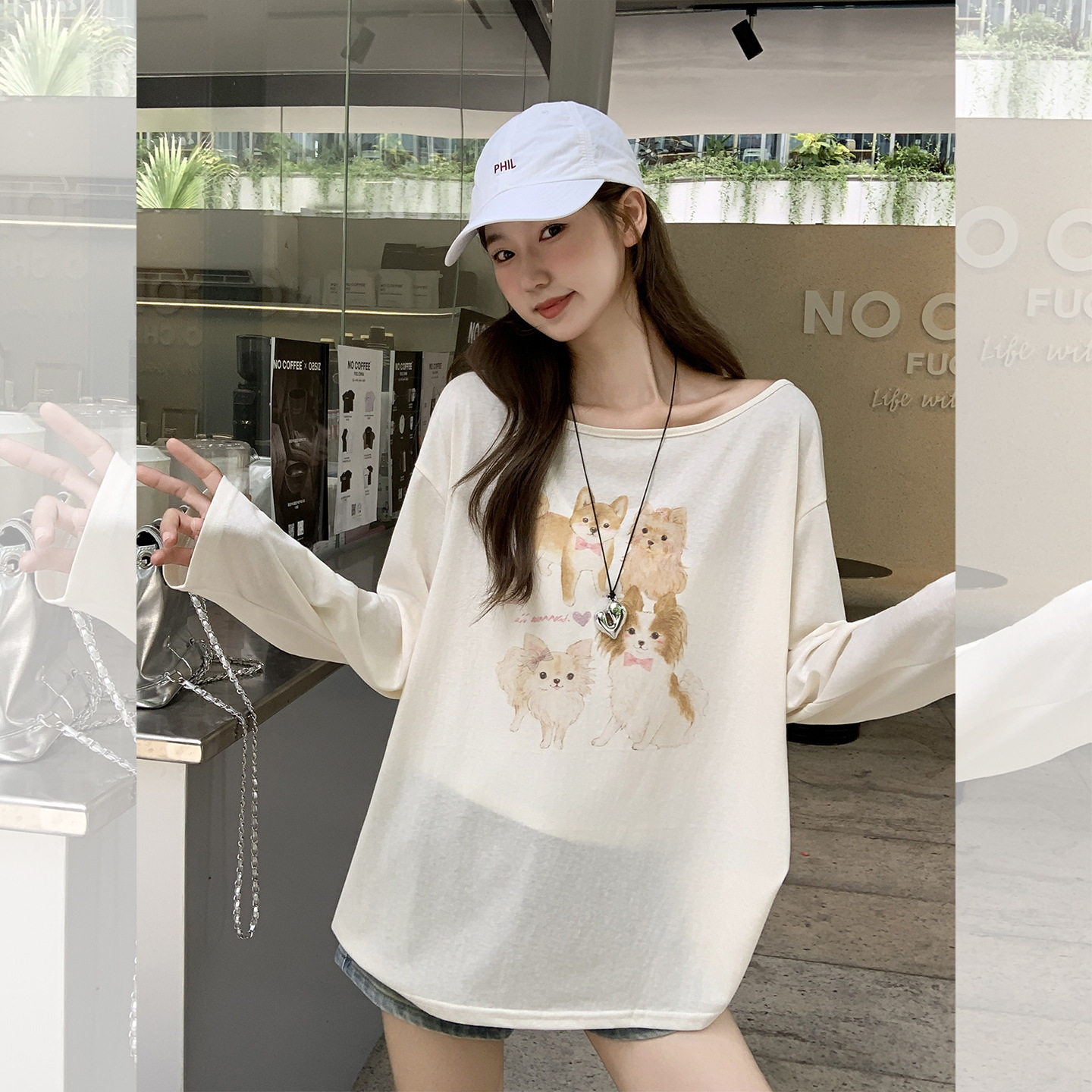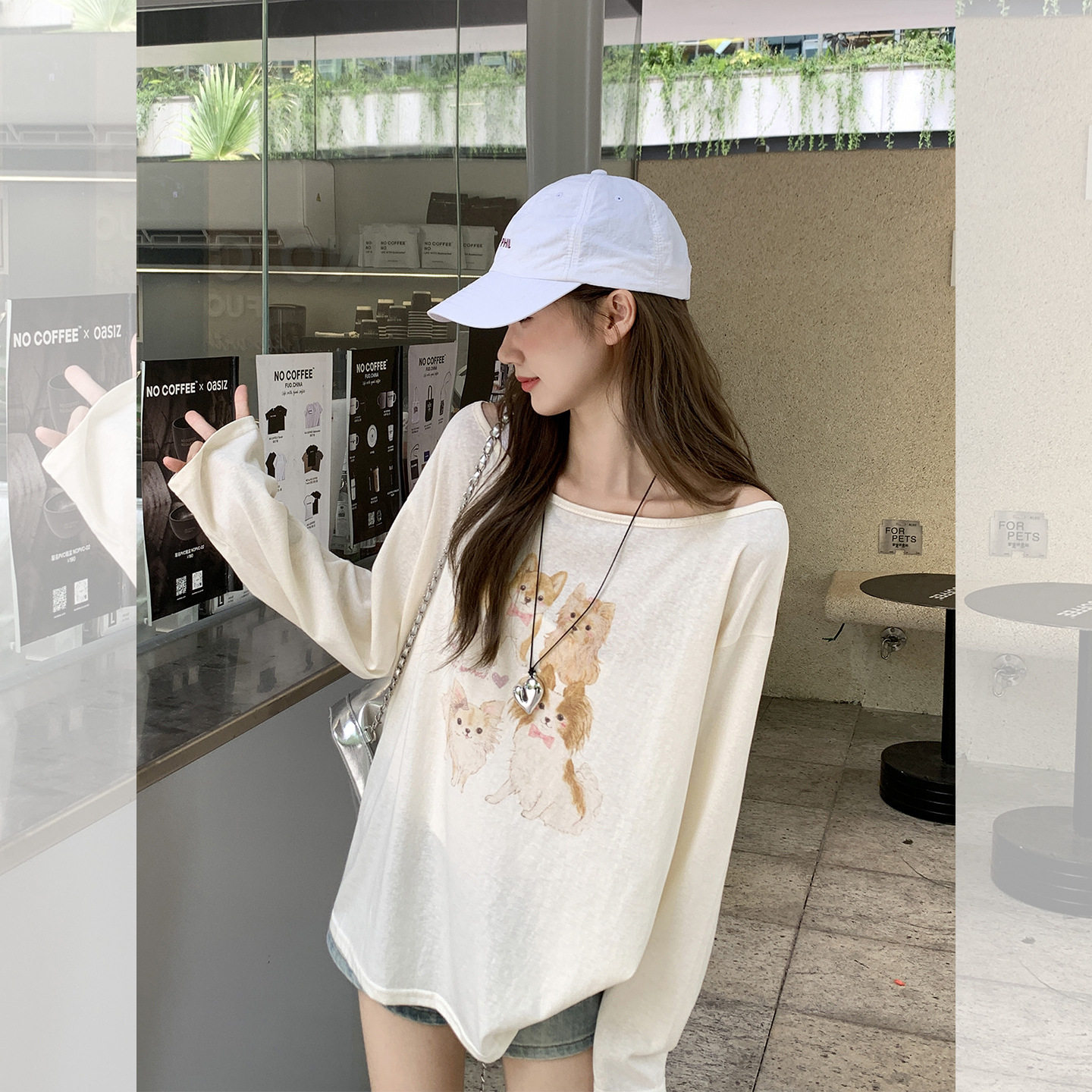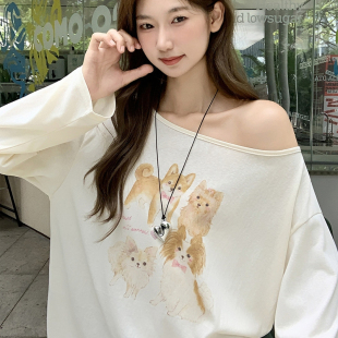杏色卡通小狗印花斜肩长袖 T恤女2025初秋设计感露肩上衣 防晒罩衫