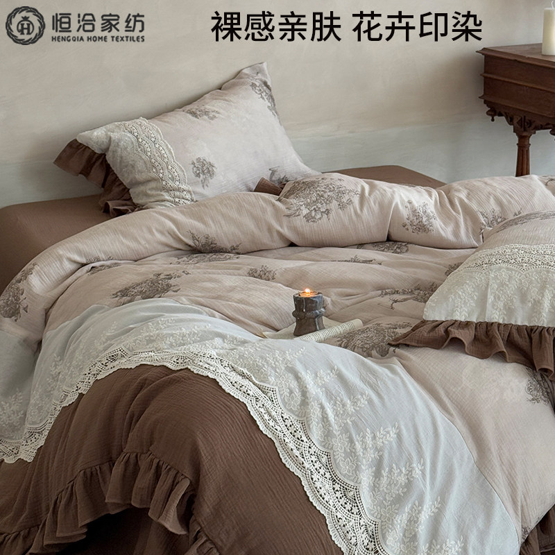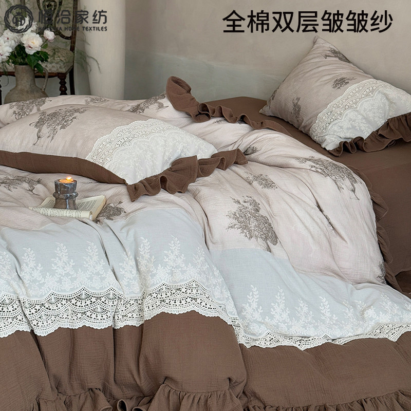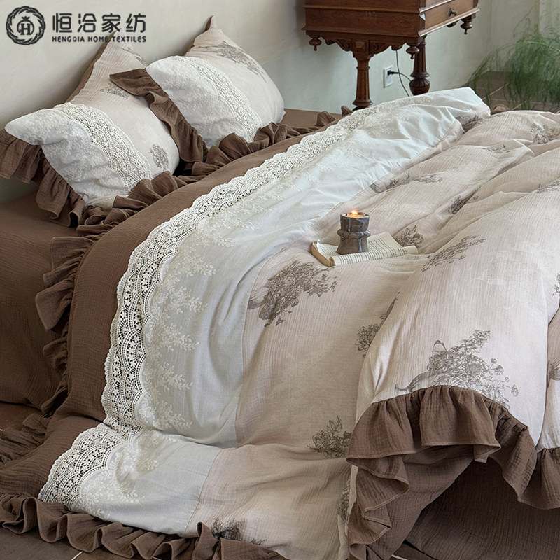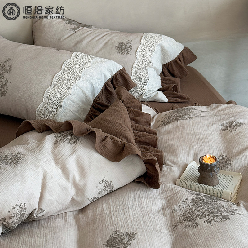 复古超柔全棉双层皱皱纱四件套花卉数码 印花棉质花边被套床品咖色