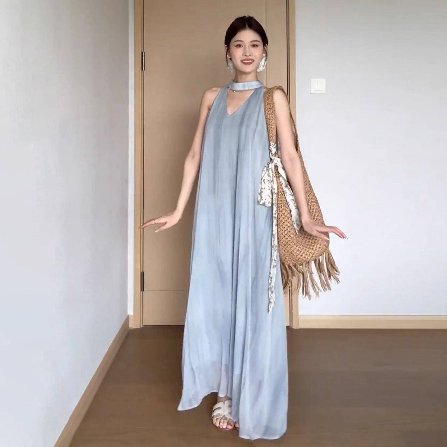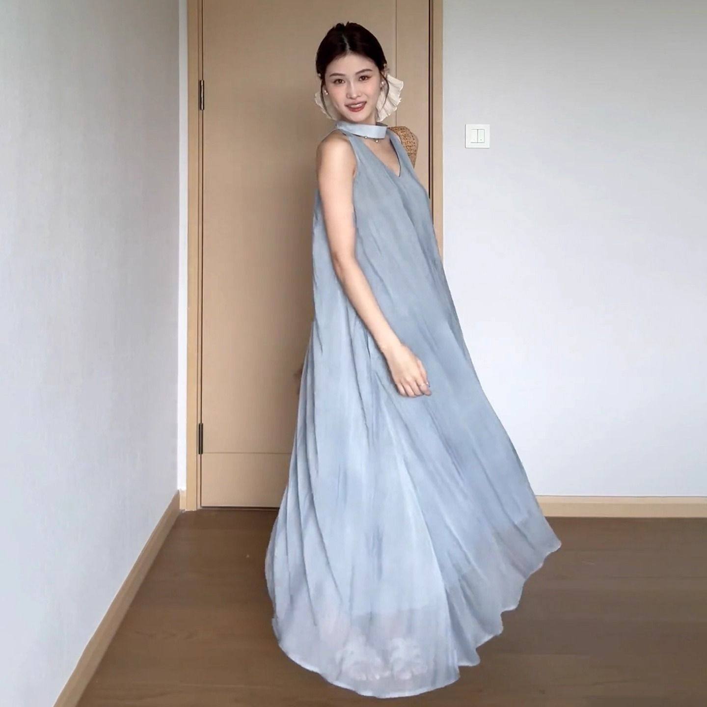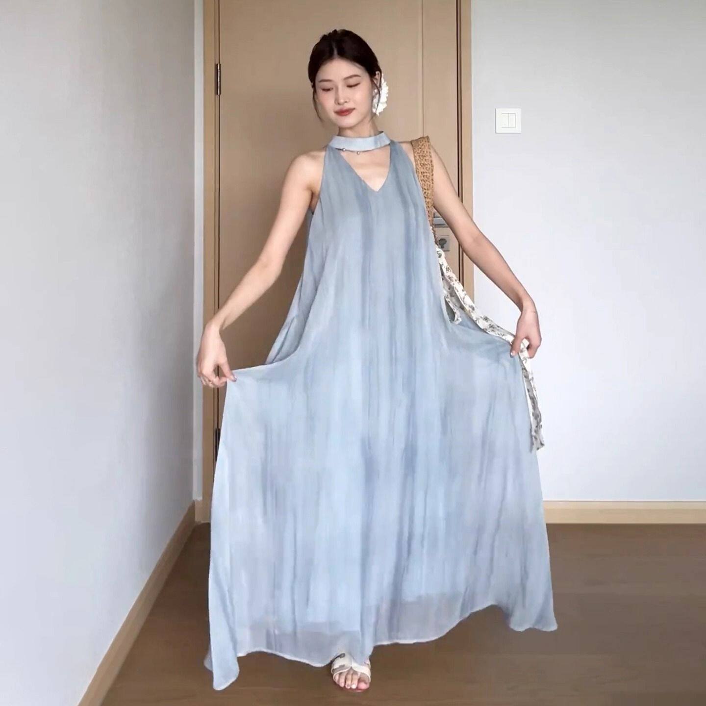 日系森系田园风蓝色挂脖吊带连衣裙子女夏季 海边度假气质长裙 新款