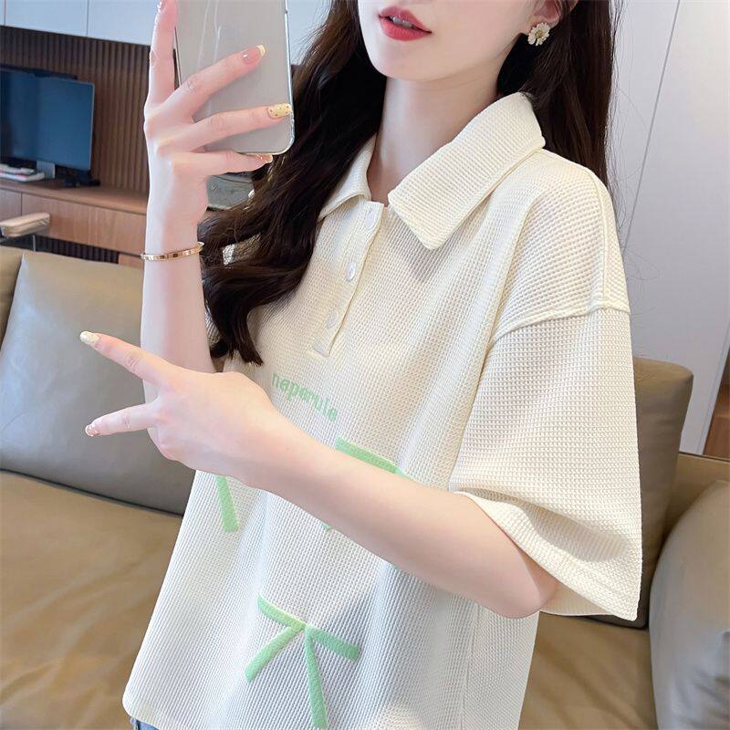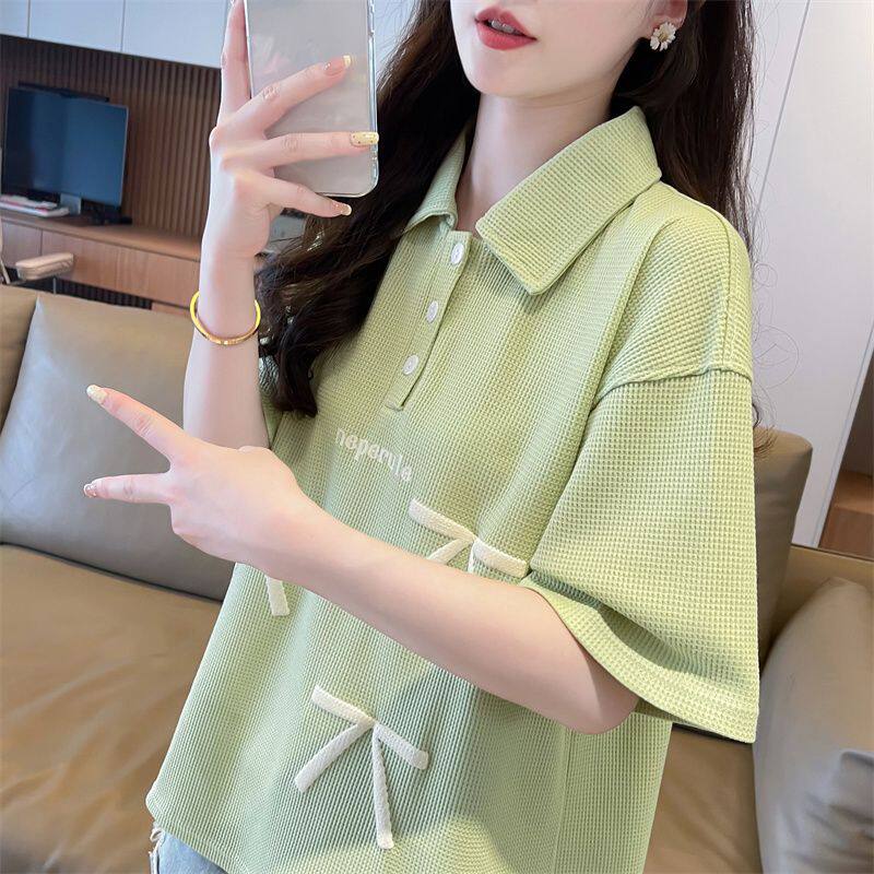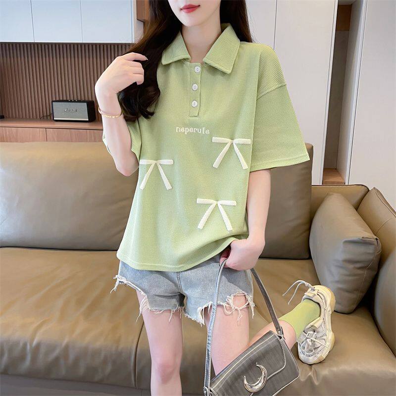 polo领小个子宽松大码 夏季 上衣女 设计感蝴蝶结t恤女短袖 跨境女装