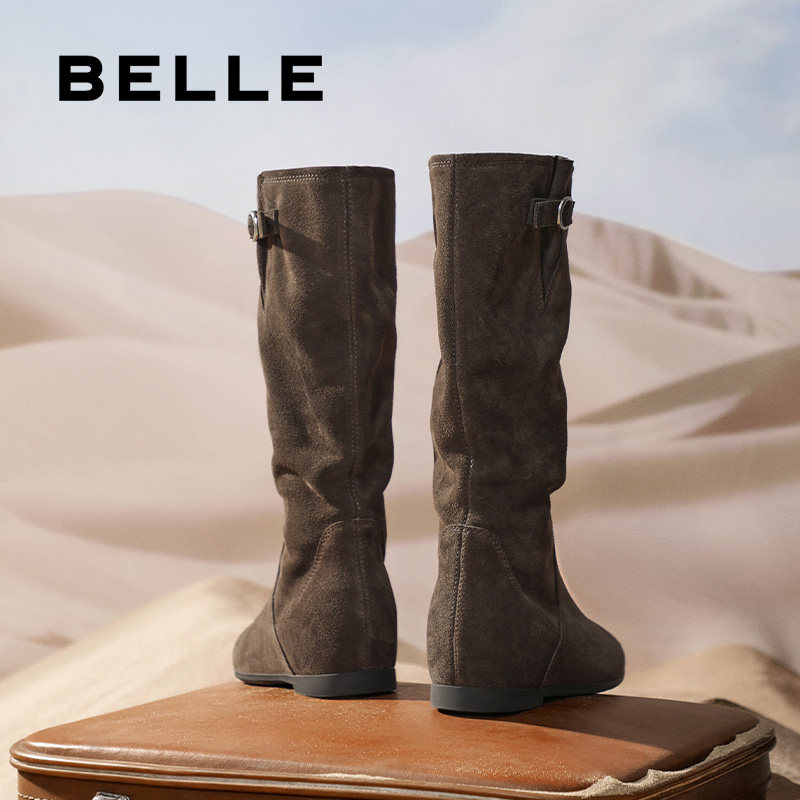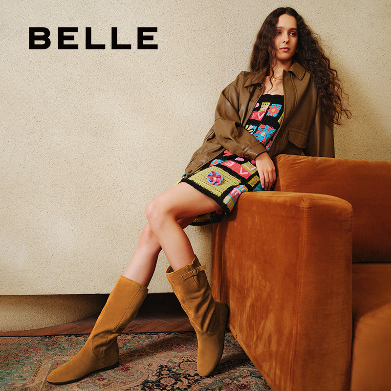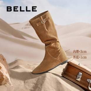 百丽女靴子复古西部靴堆堆靴加绒保暖冬季 内增高筒靴E5Y1DDG5 新款