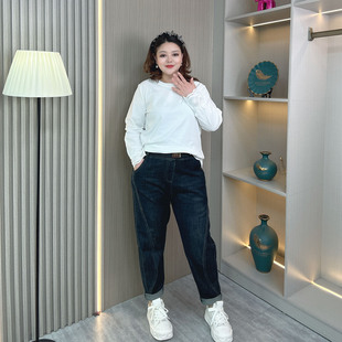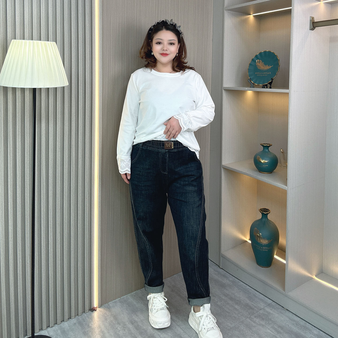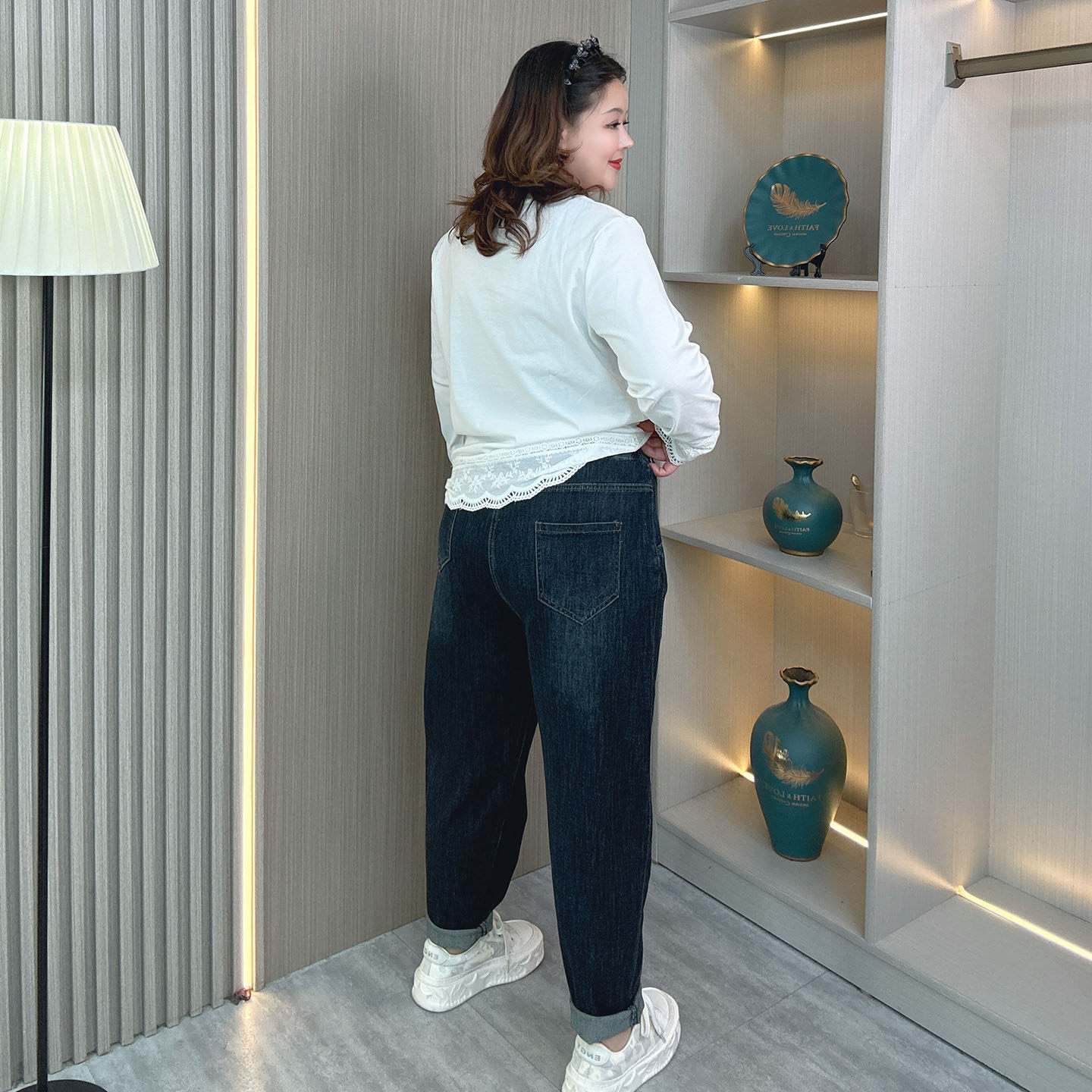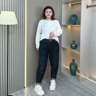 子松紧腰弹力宽松遮胯显瘦老爹裤 大码 哈伦牛仔裤 胖mm春秋新款 女装