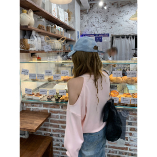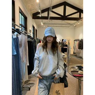 设计感V领挂脖露肩卫衣韩系微胖mm显瘦长袖 镜头焦点 上衣 鱼 你