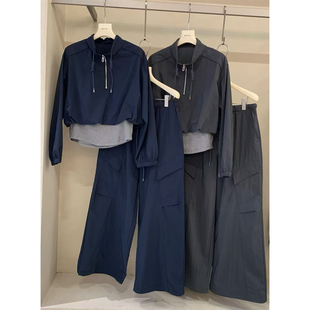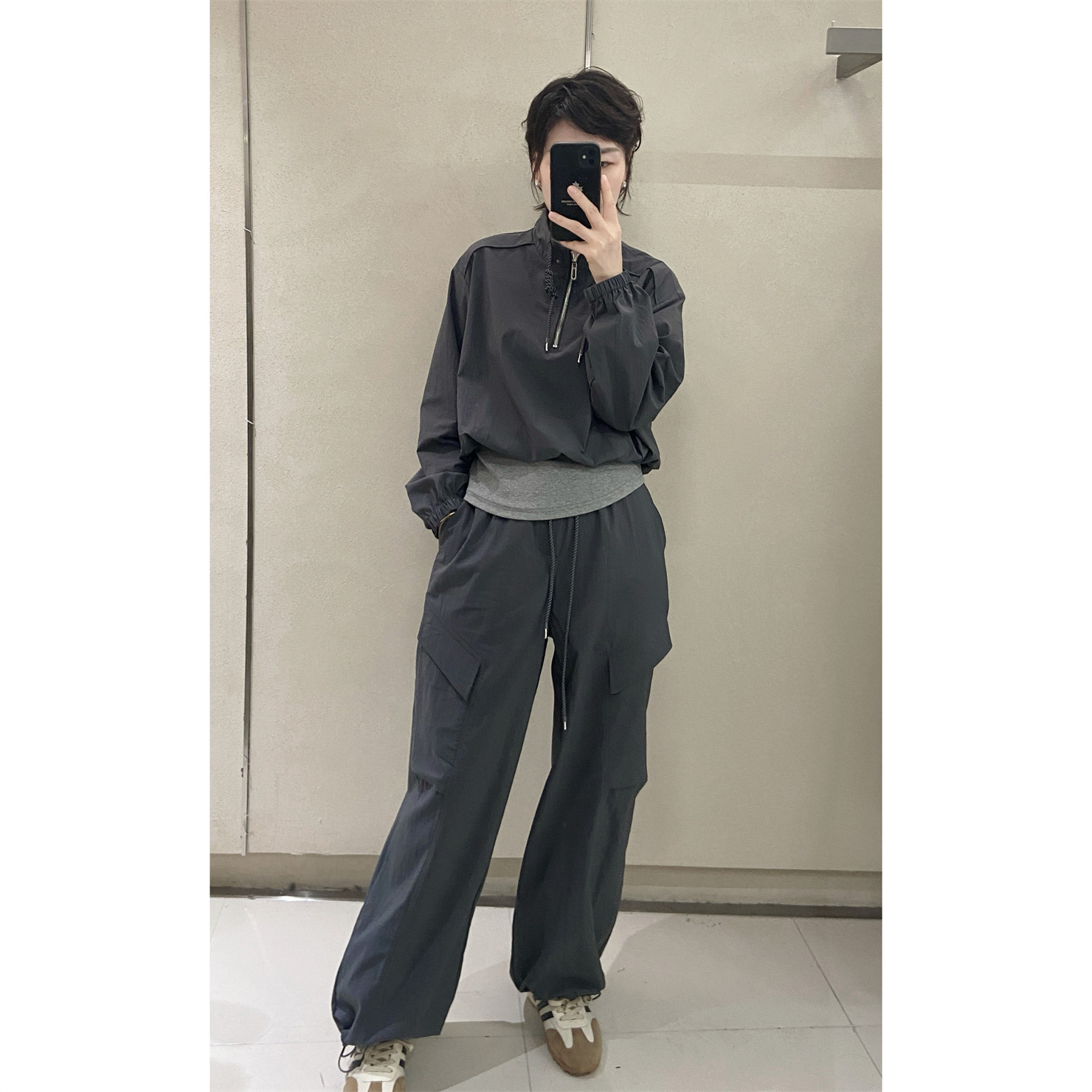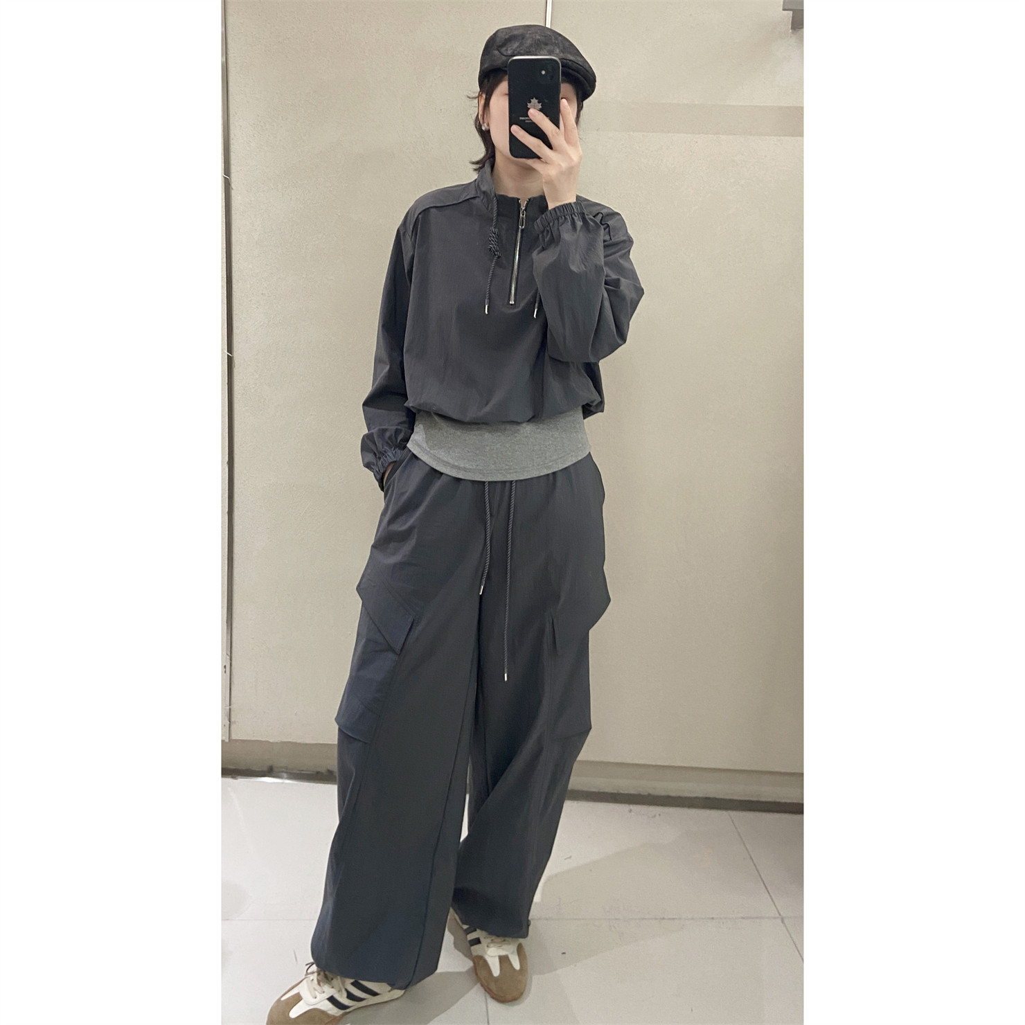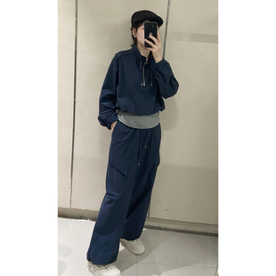 假两件拼接立领上衣松紧腰阔腿裤 工装 新款 女2025秋季 休闲两件套装