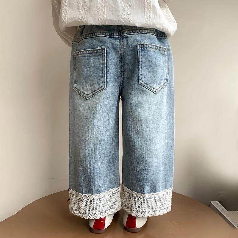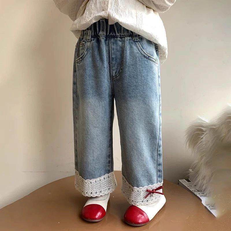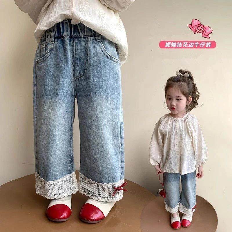 洋气拼接花边直筒裤 新款 2025秋季 韩韩良品中大童红色蝴蝶结牛仔裤