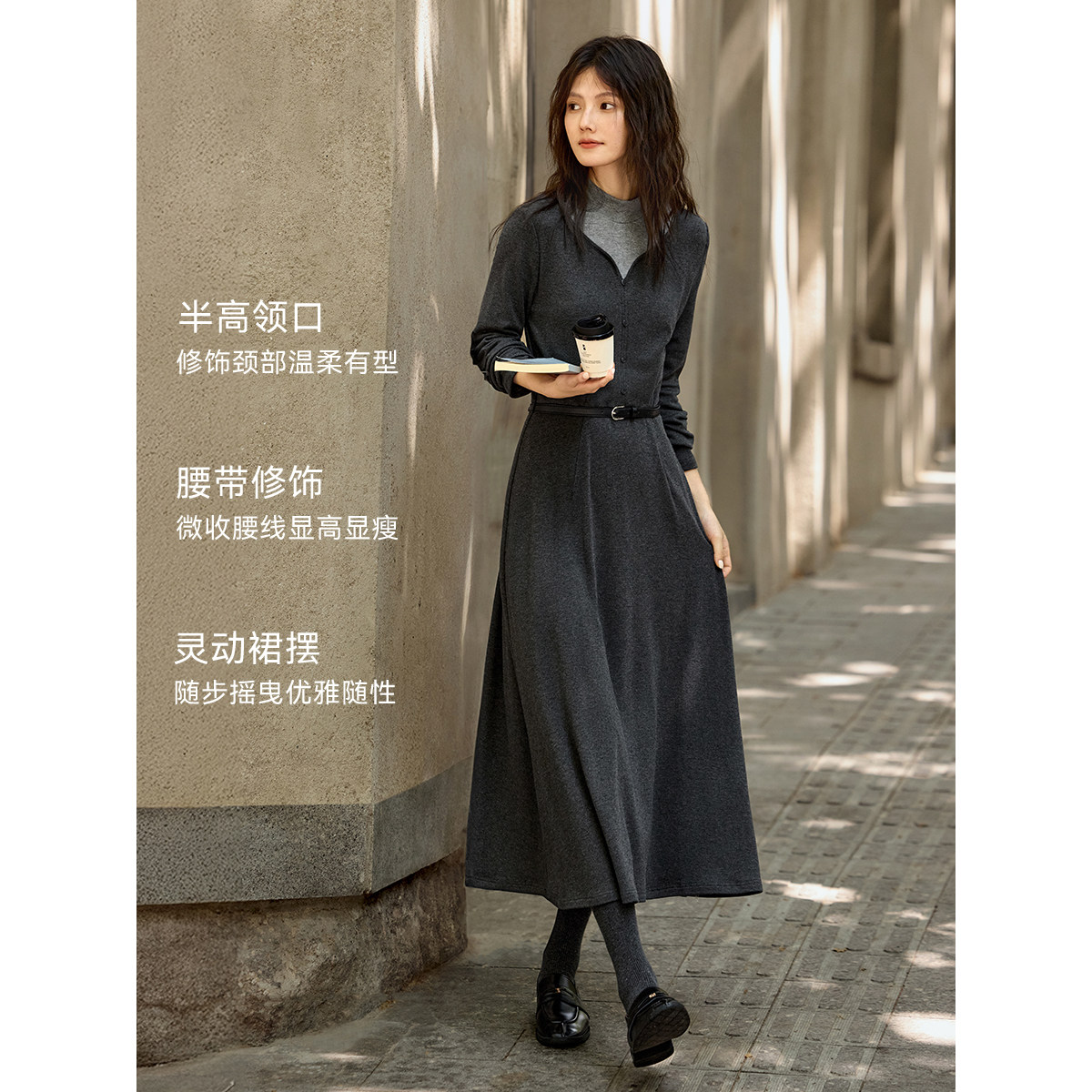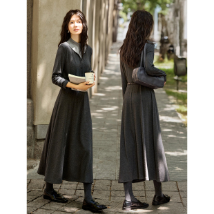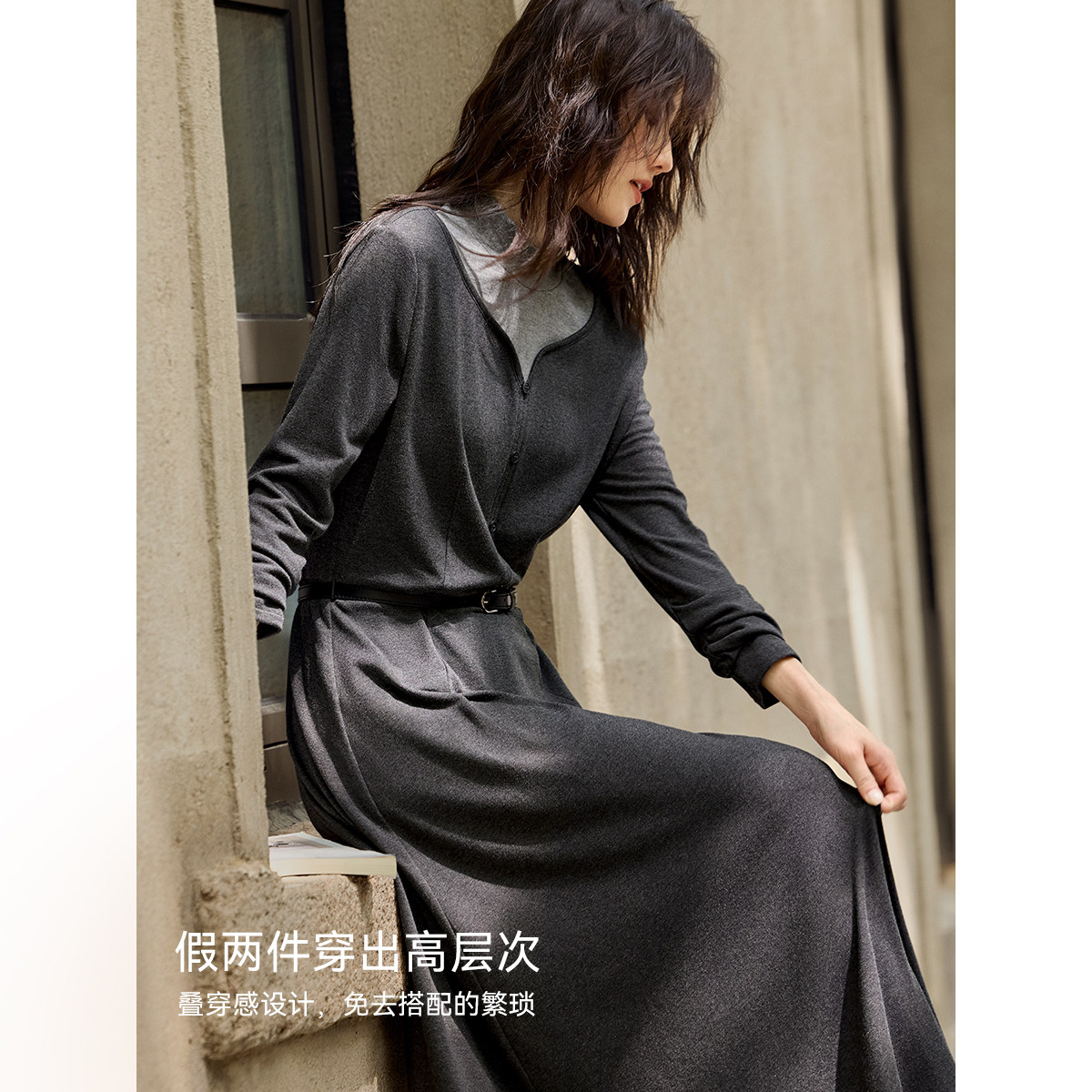 XWI欣未假两件拼接半高领连衣裙女秋冬内里抓绒感腰带收腰显瘦裙