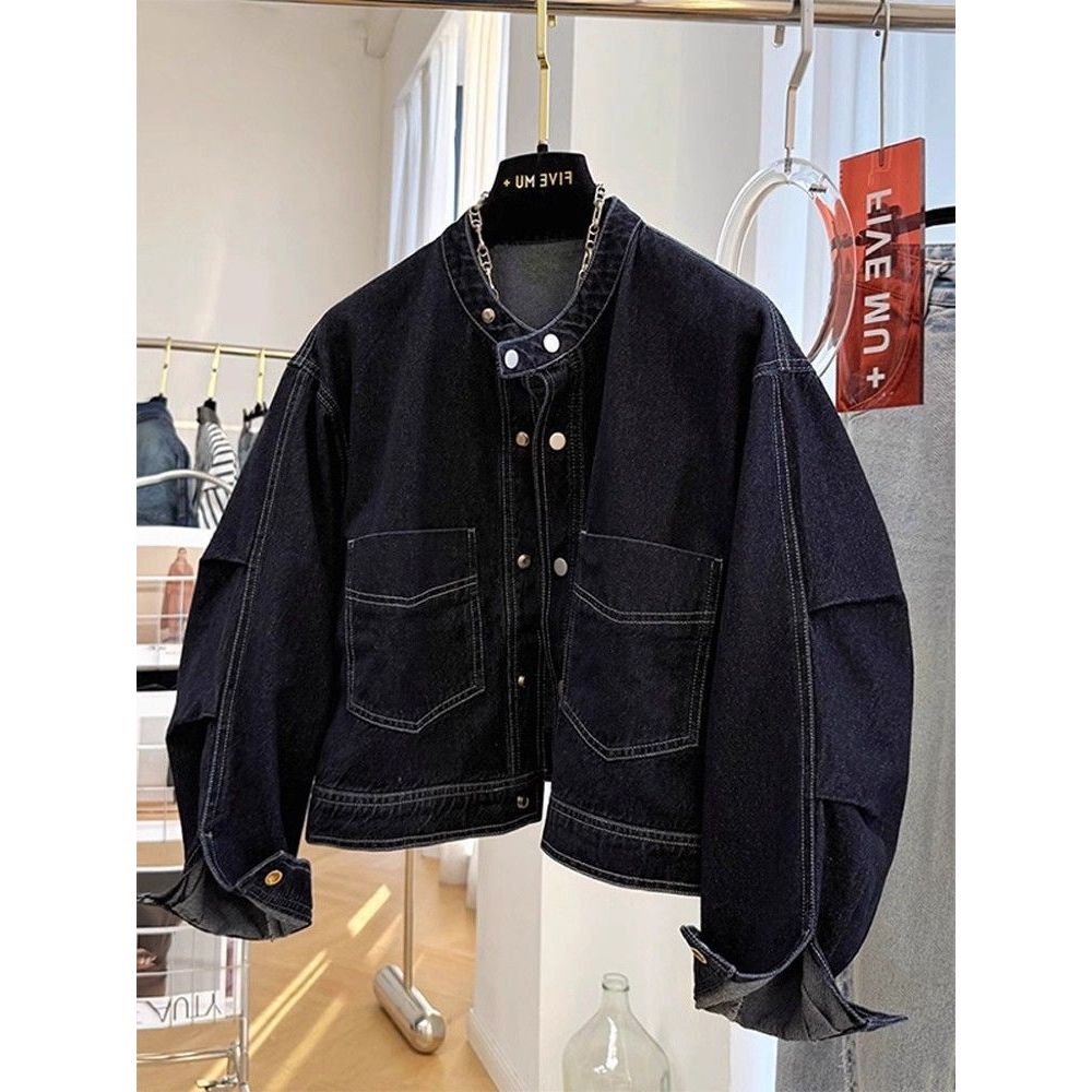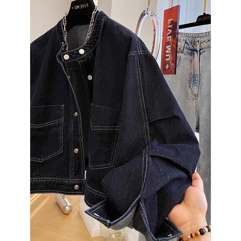 美式 夹克上衣 复古深蓝色圆领牛仔外套女春秋高级感小个子宽松短款