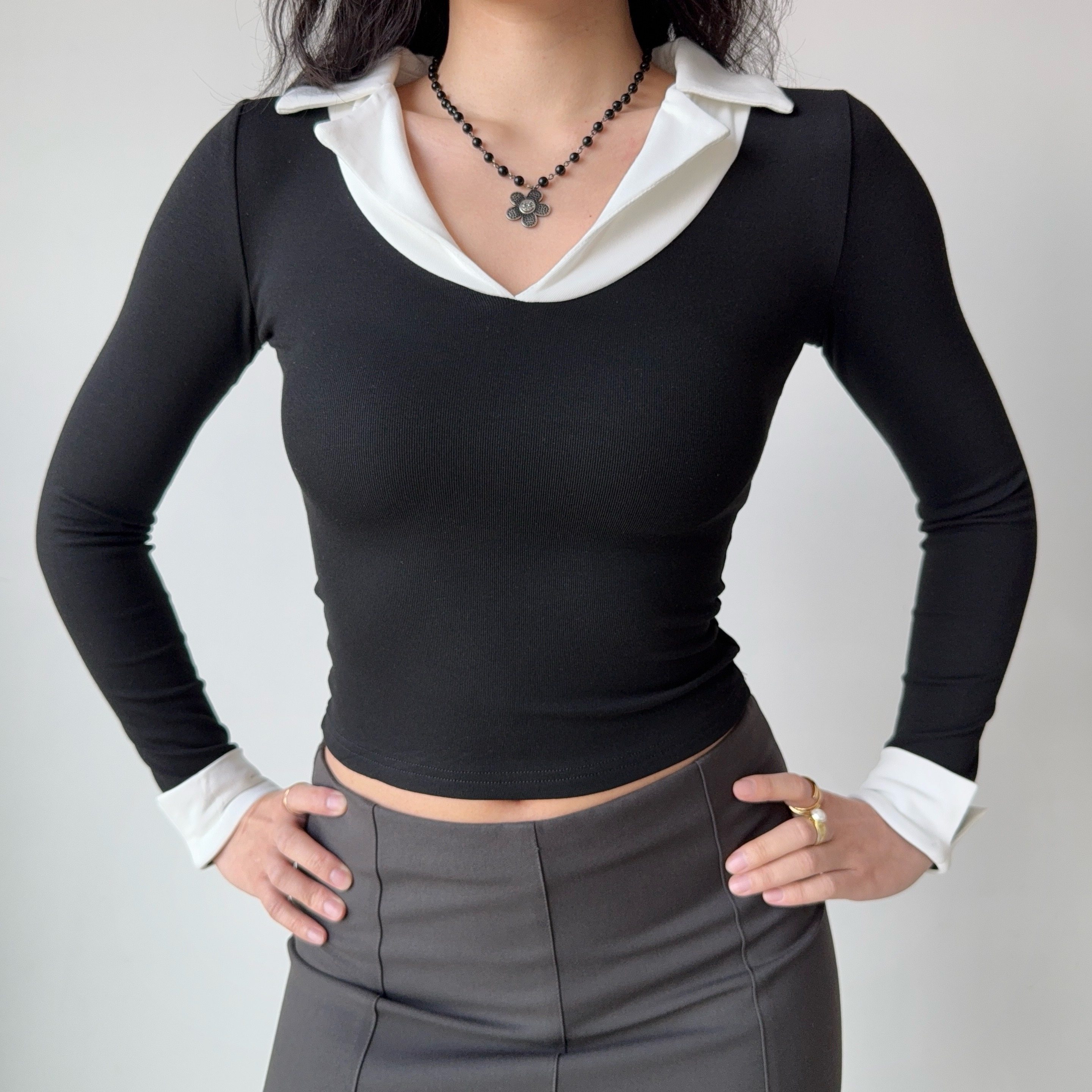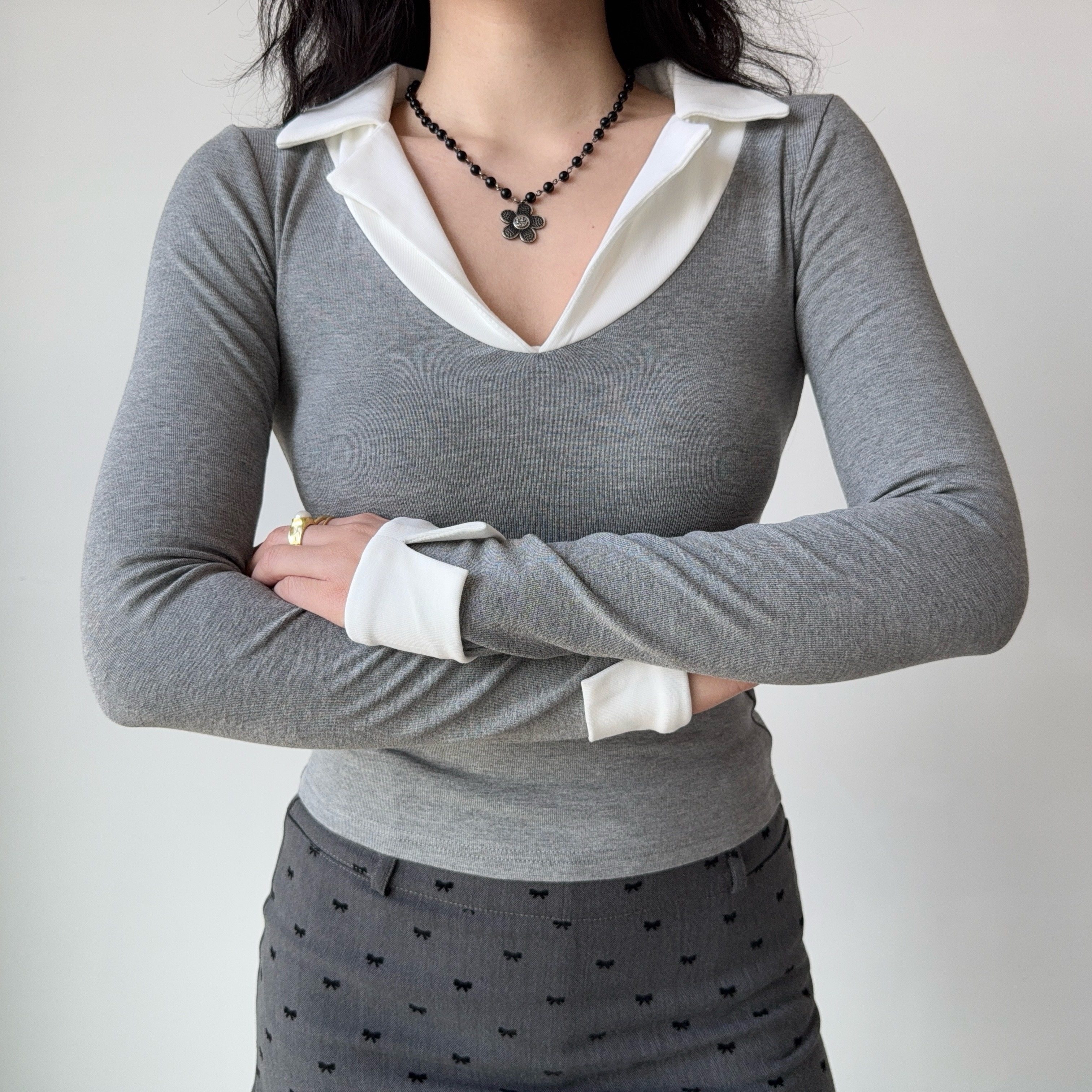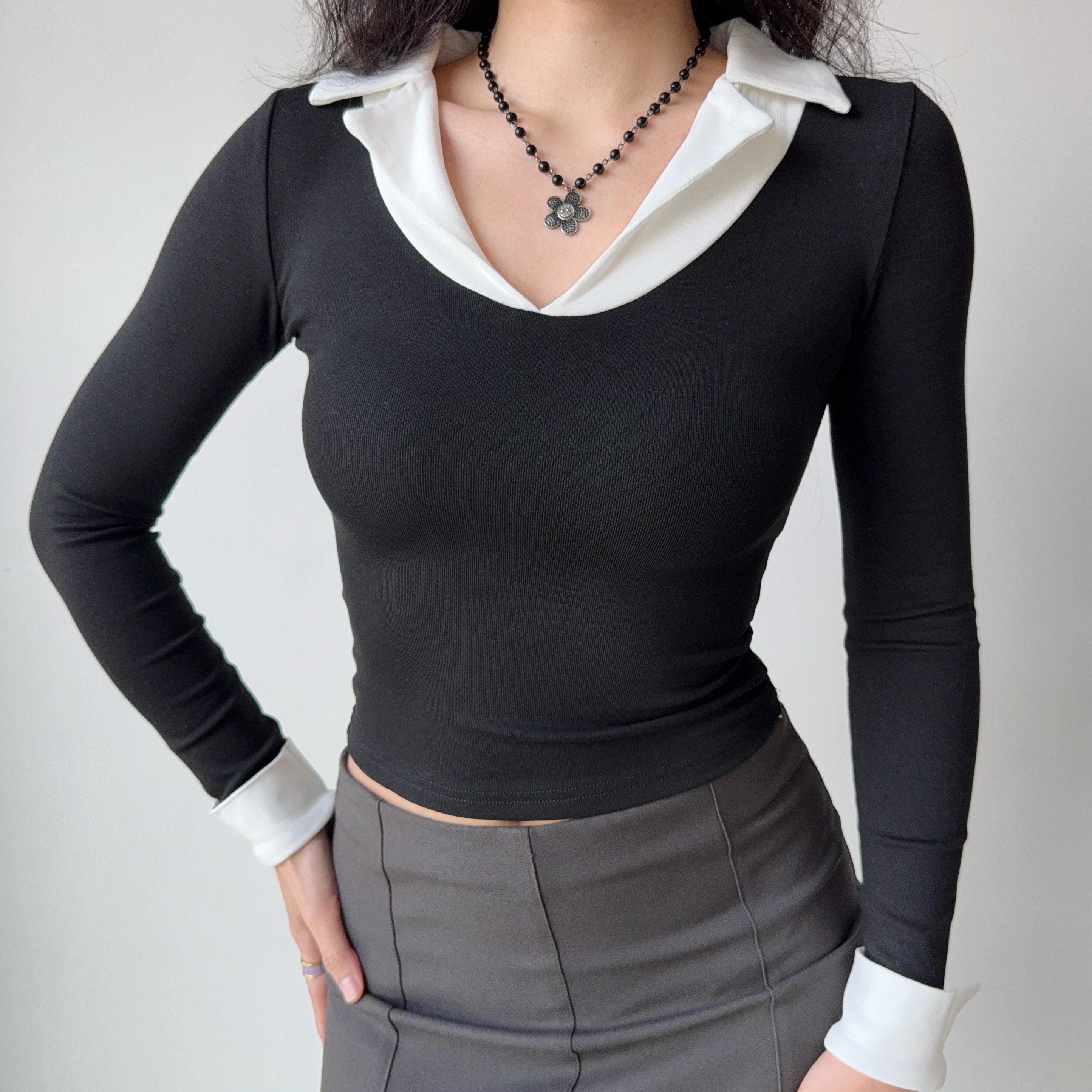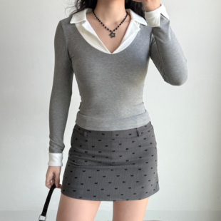Girl 上衣女早秋新品 欧美风假两件翻领长袖 短款 T恤修身