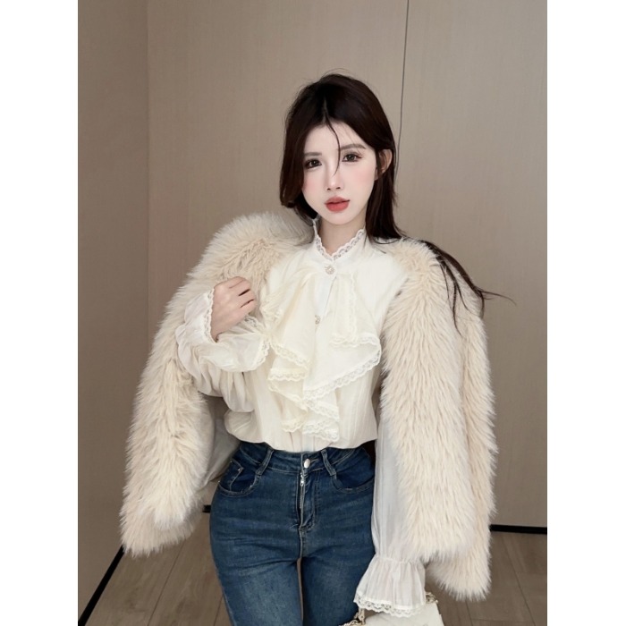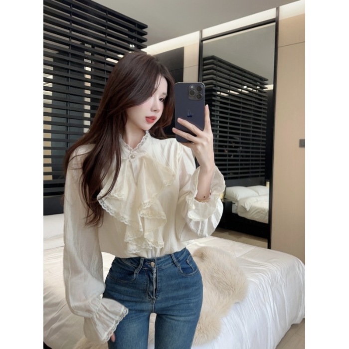 新款 女早秋季 气质蕾丝拼接小衫 长袖 上衣 法式 开衫 宫廷风荷叶边衬衫