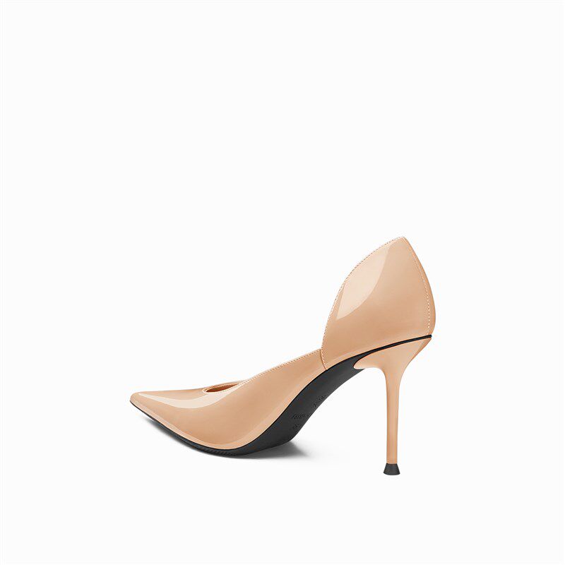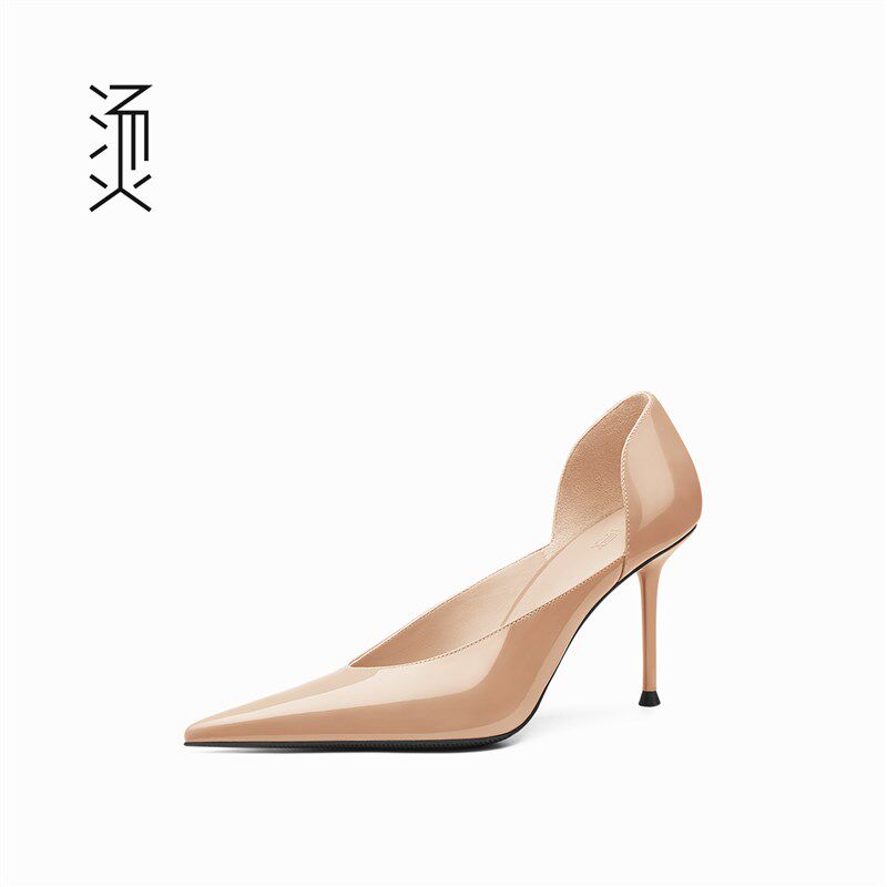 气质中空女单鞋 法式 2025春夏新品 烫裸色亮面漆皮尖头细跟高跟鞋