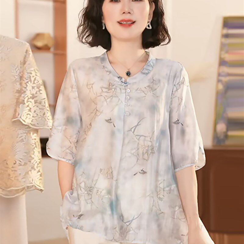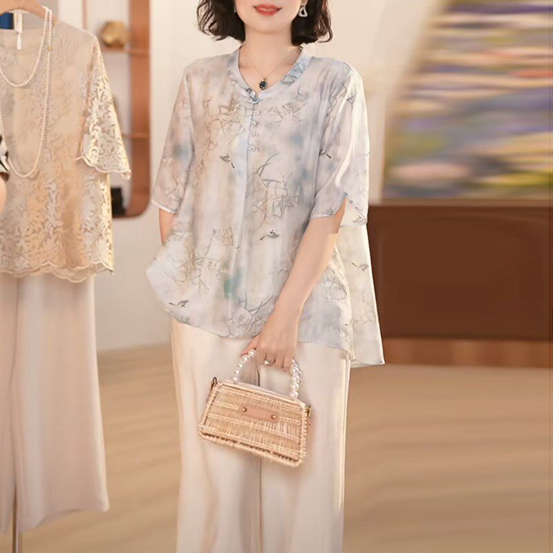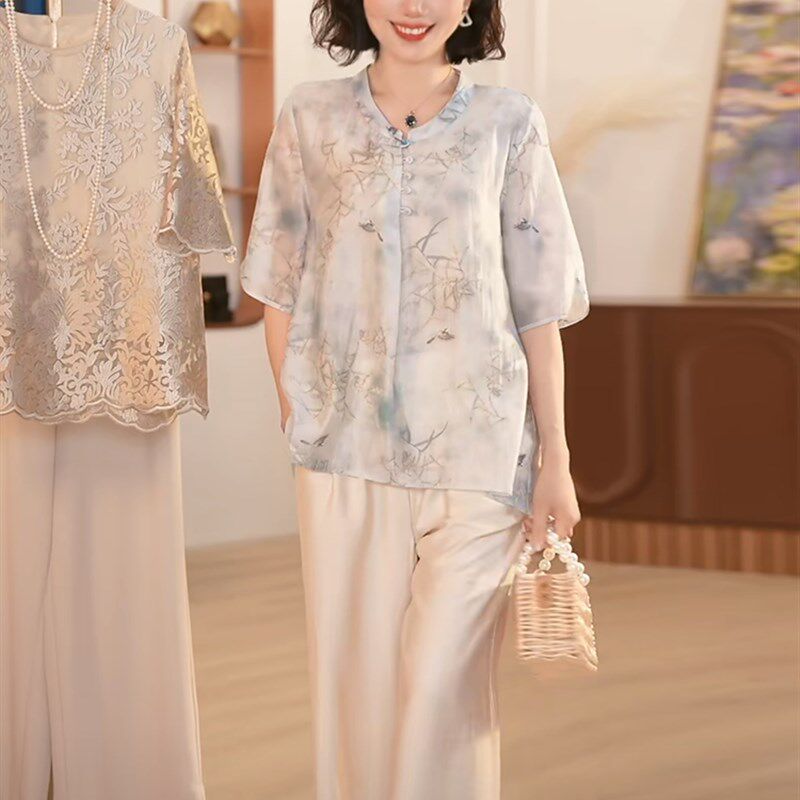 短袖 中年夏季 夏装 女中老年宽松洋气两件套妈妈装 T恤上衣 休闲套装
