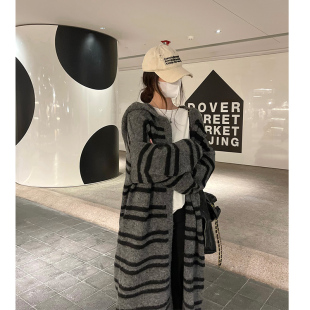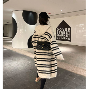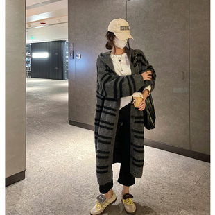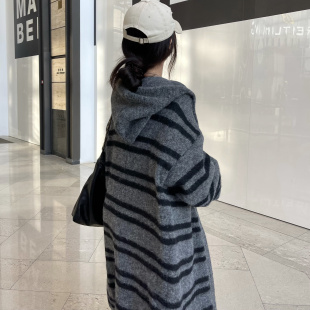 毛衣外套 中长款 巨好看 早春穿搭慵懒松弛感撞色条纹连帽针织开衫