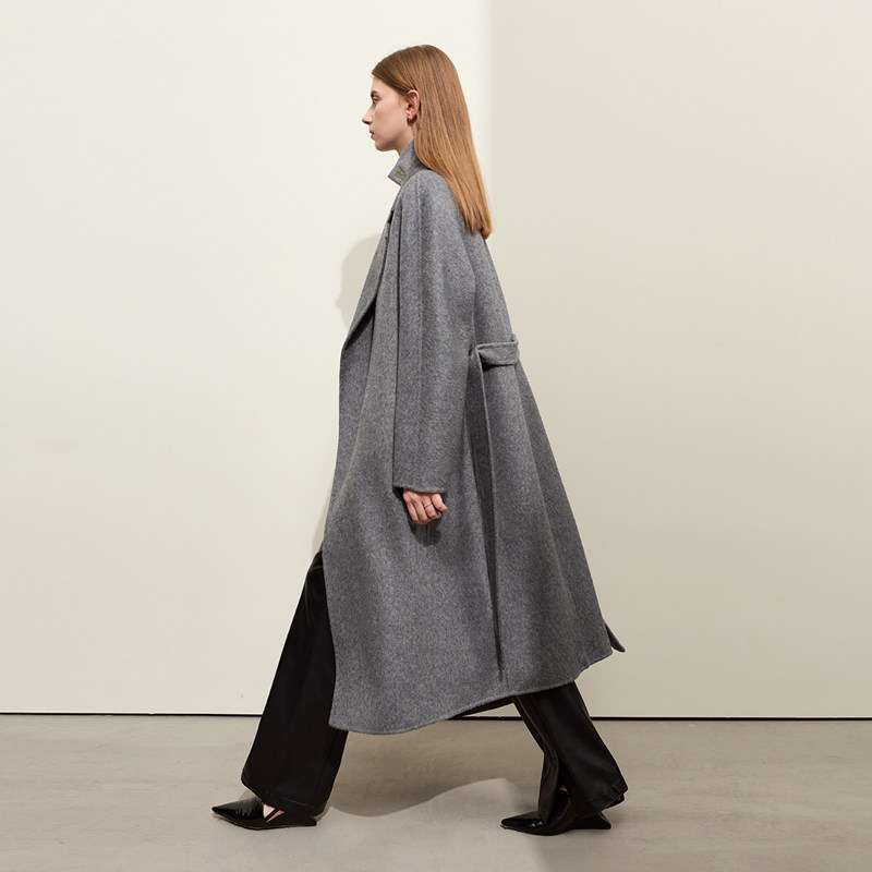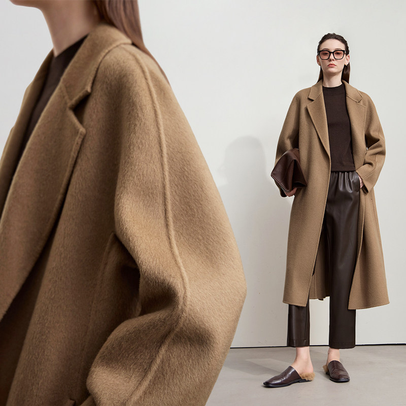 Amii2026冬新款 大衣 绵羊毛桑蚕丝骆驼绒双面呢女配腰带浴袍风长款