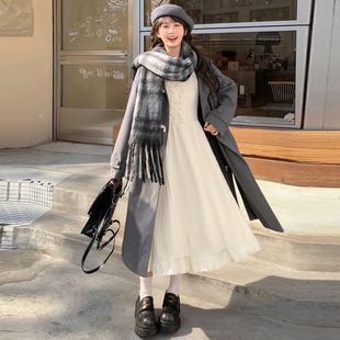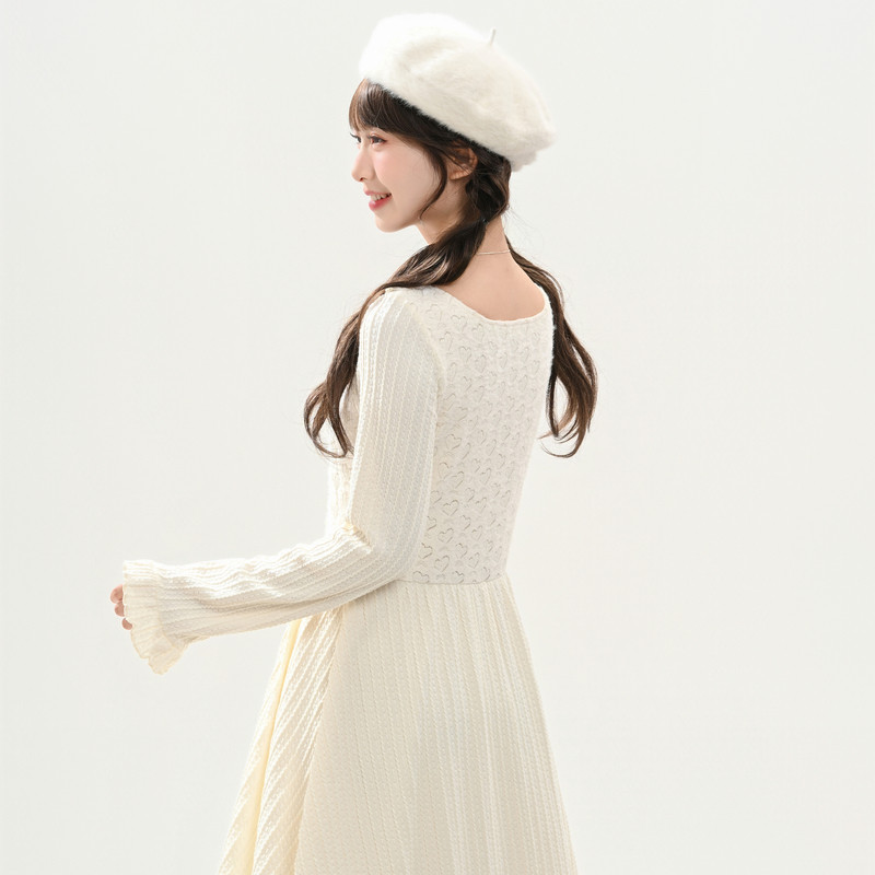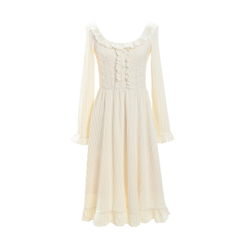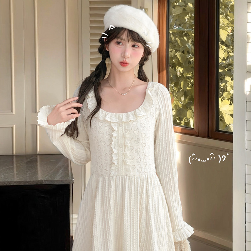森女部落甜美秋冬打底仙女裙子花边方领气质淑女长裙连衣裙女新款