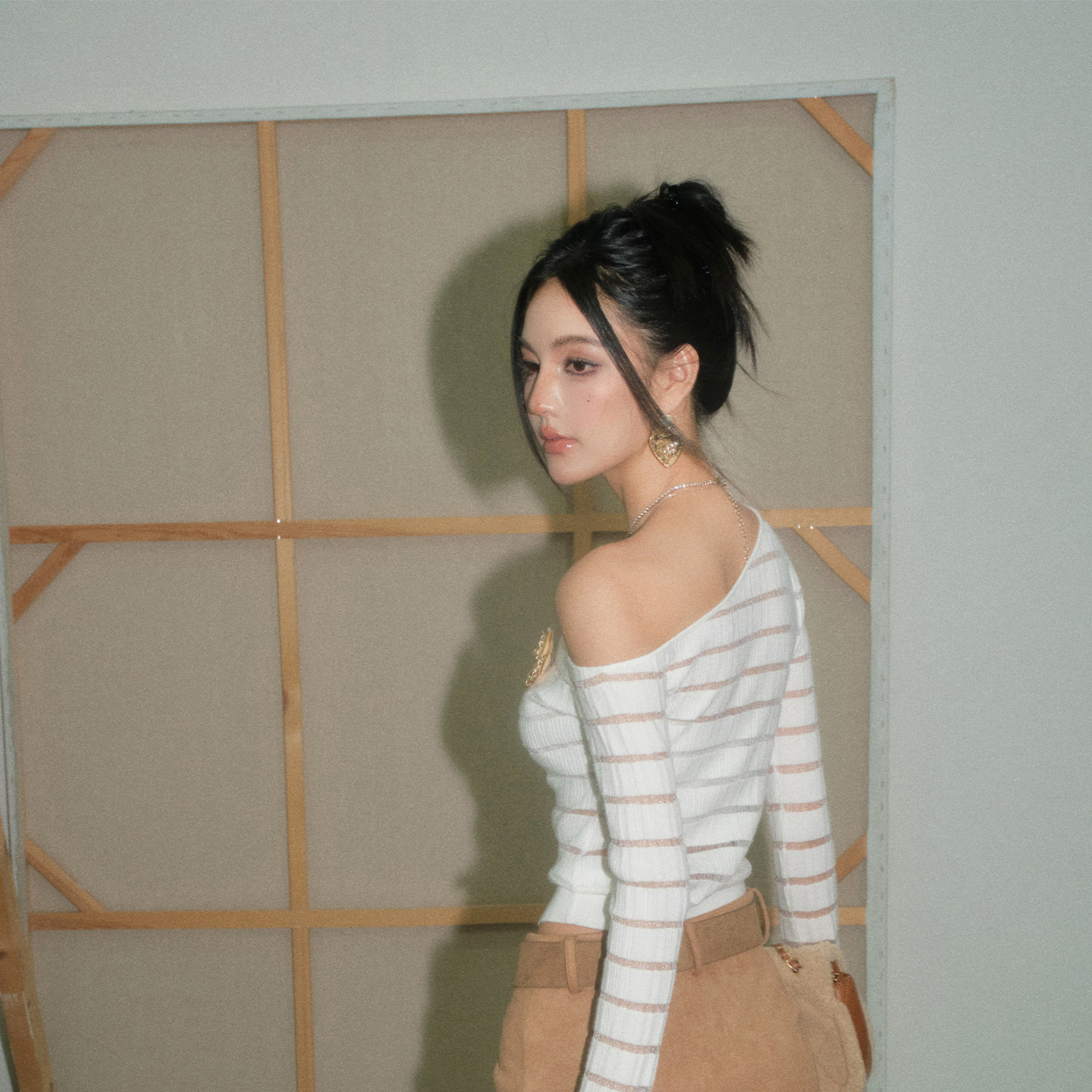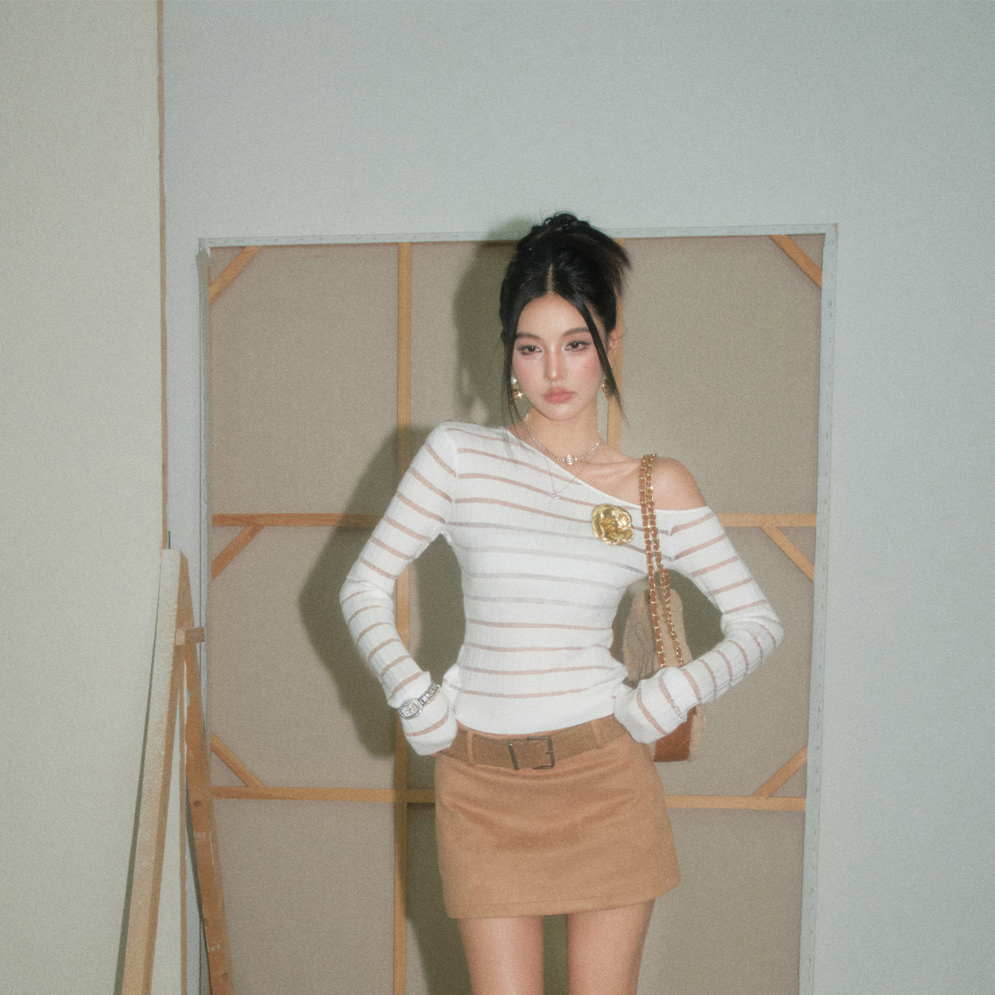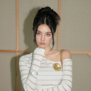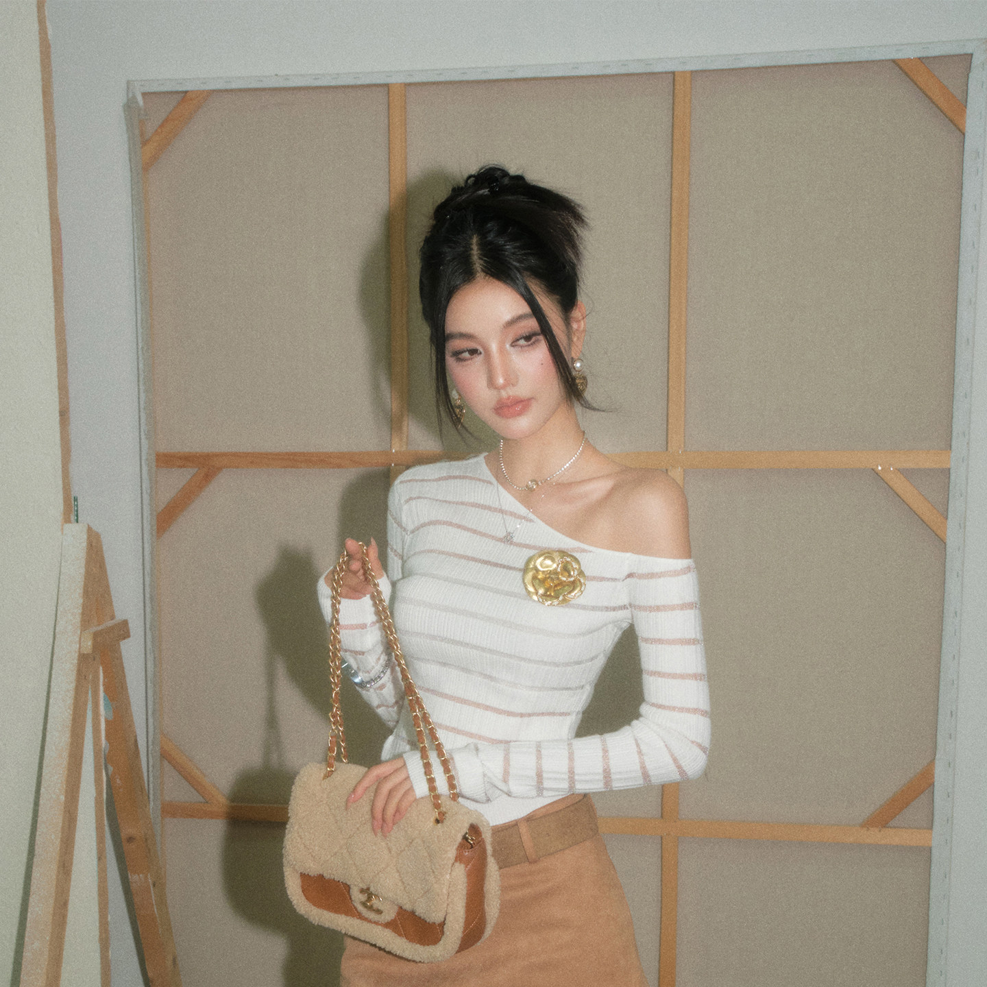 现货 长袖 OLIVIA 修身 上衣 DUO条纹镂空斜肩上衣高级甜辣风短款