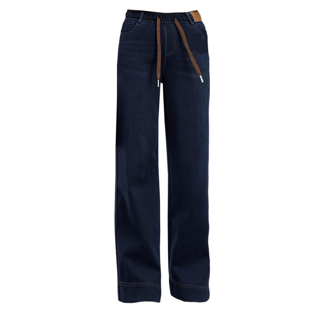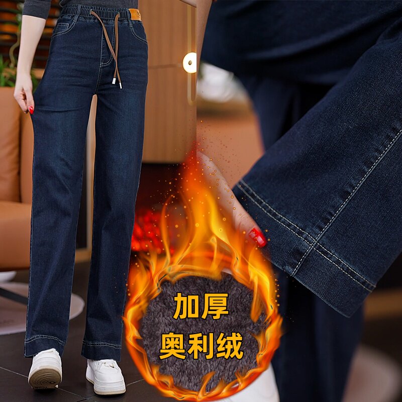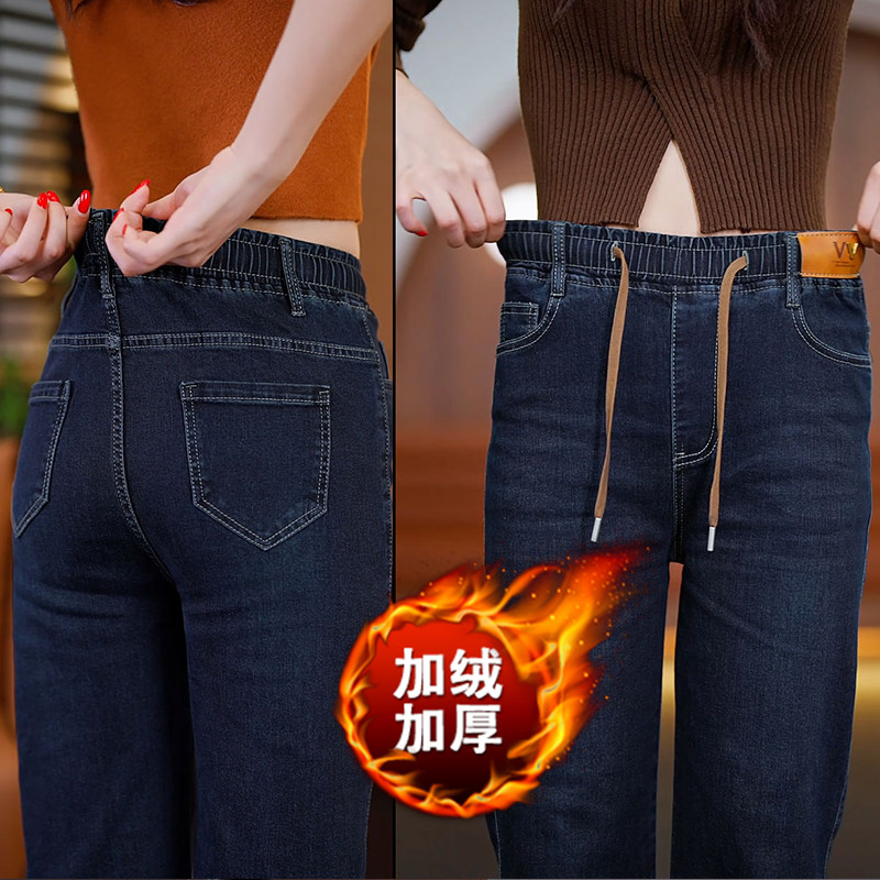 子 女妈妈高腰九分保暖直筒棉裤 冬天新款 加绒加厚松紧腰阔腿牛仔裤