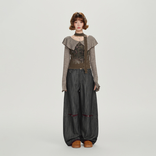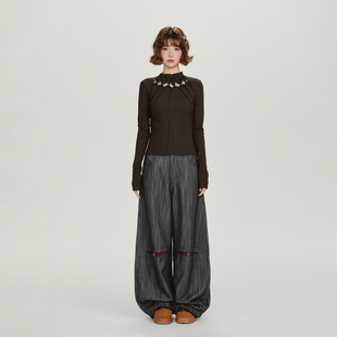 宽松长裤 Girlyhalo美式 新款 女秋季 复古竖纹撞色设计感弯刀休闲裤