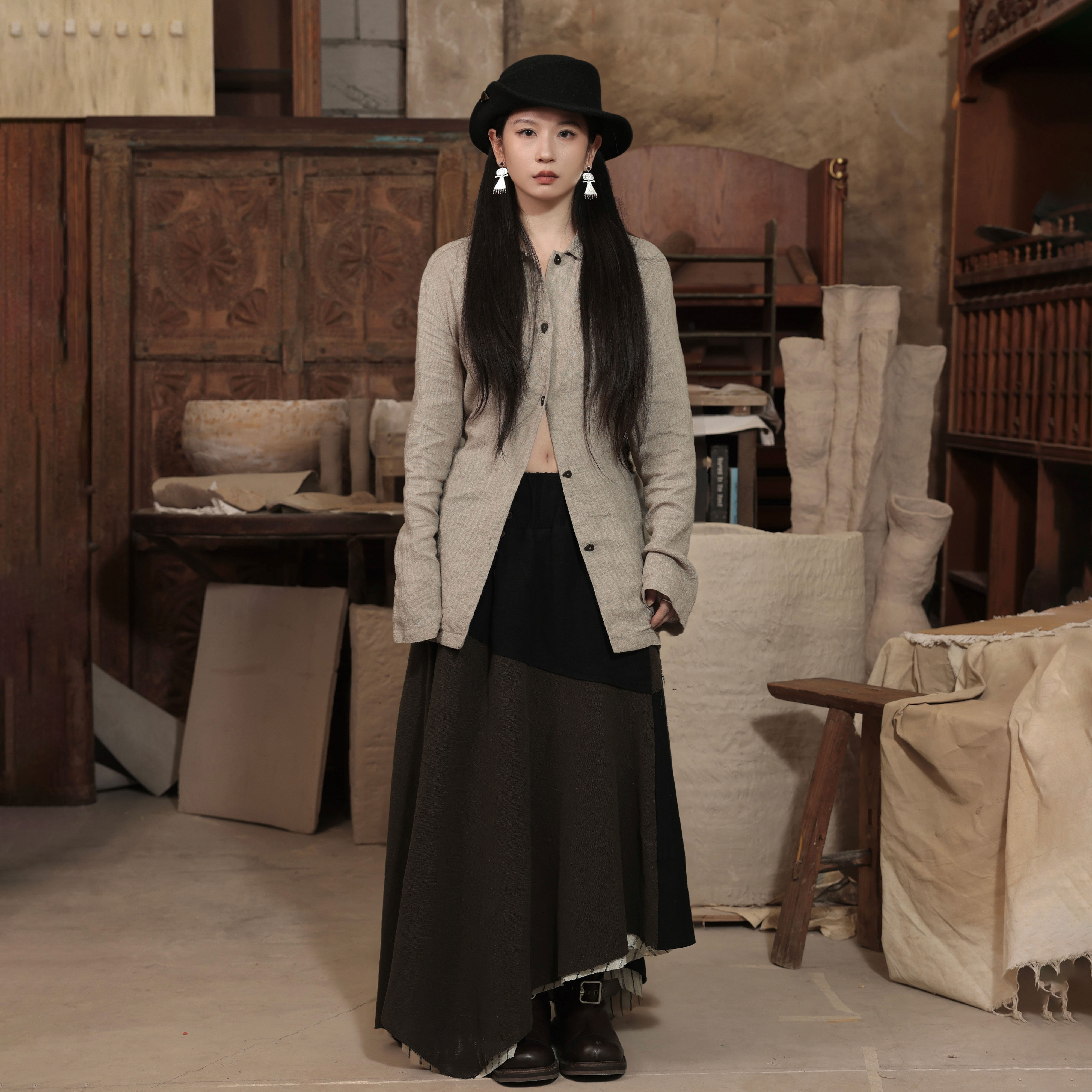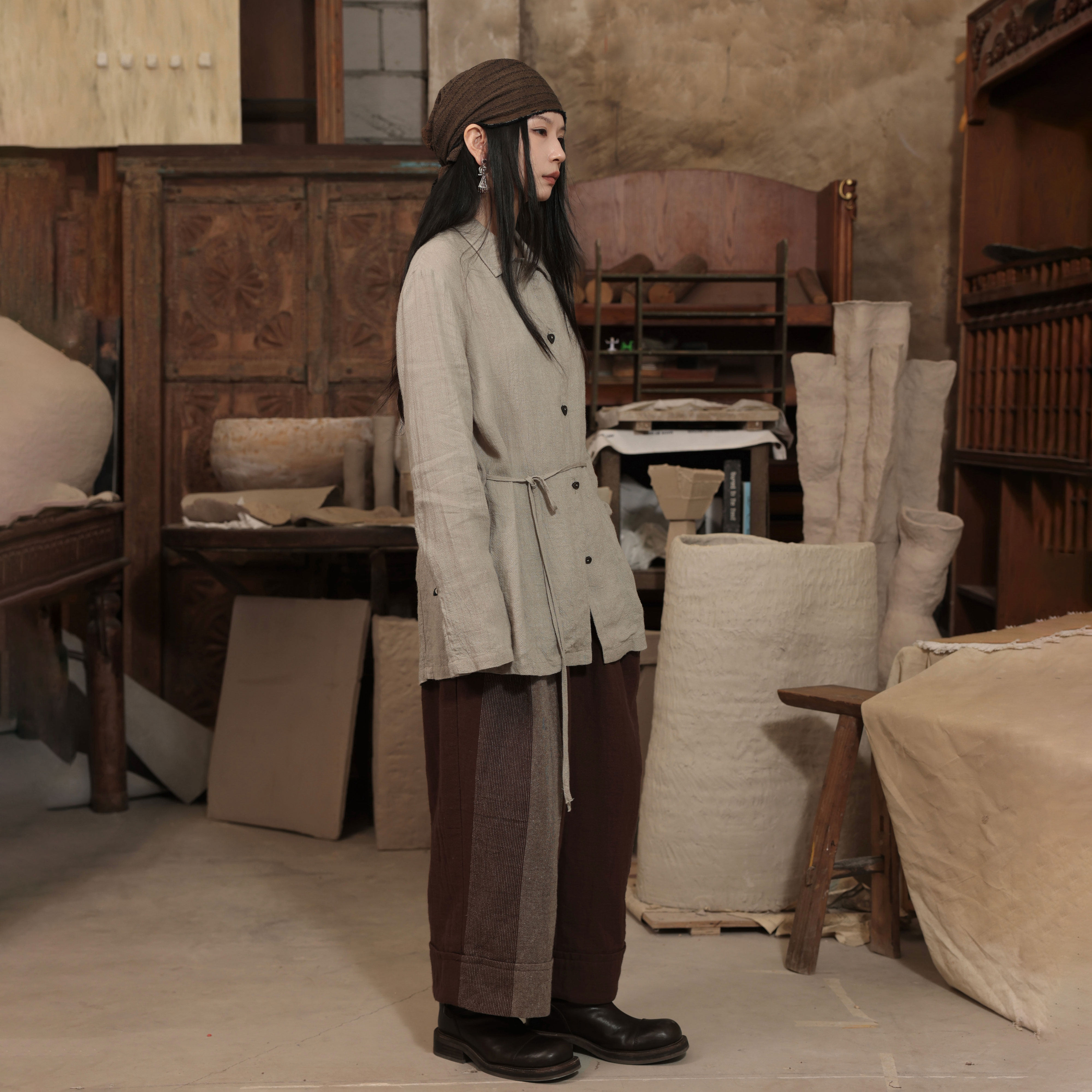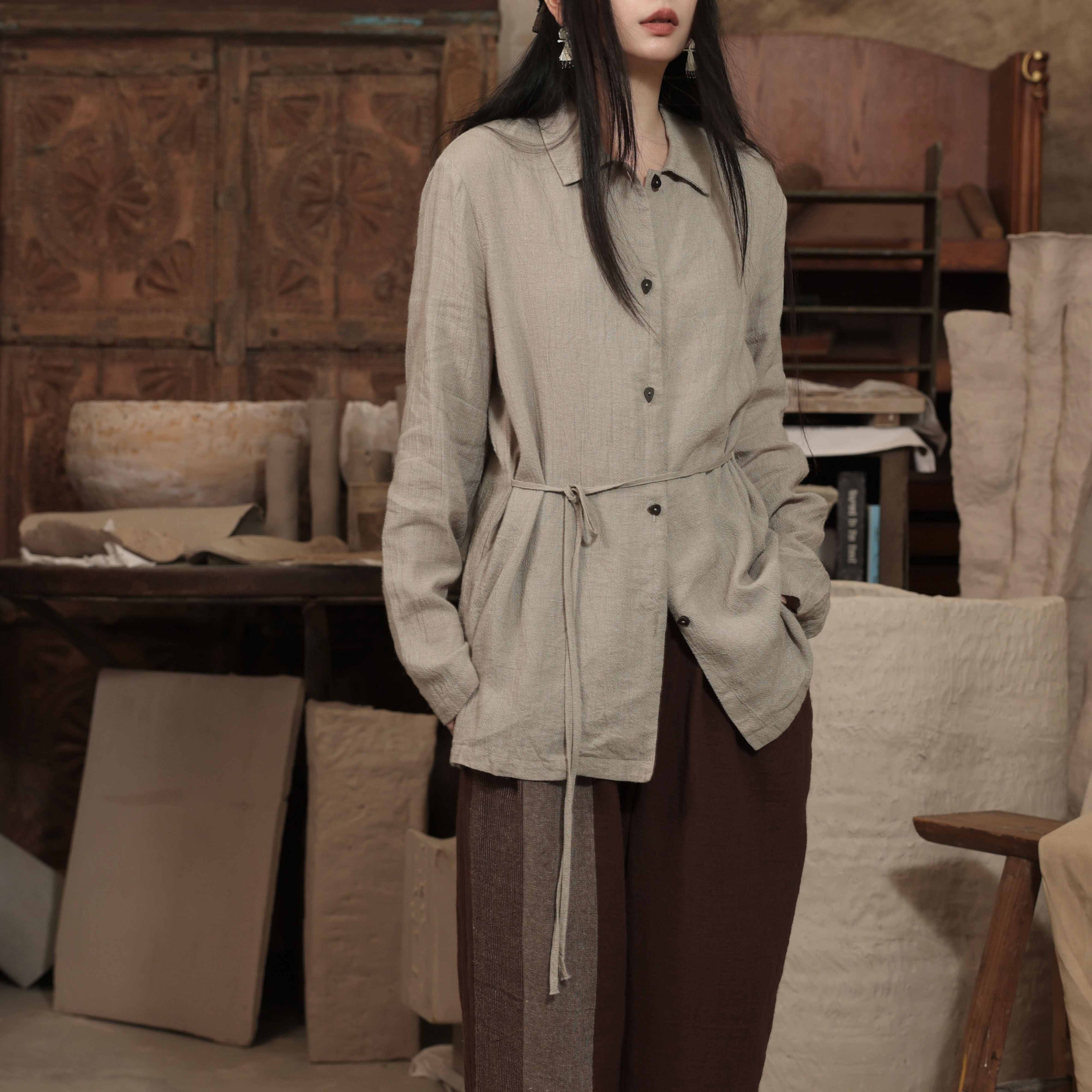 InchLim 极简多穿亚麻柞蚕丝翻领衬衫 系带收腰 肌理感