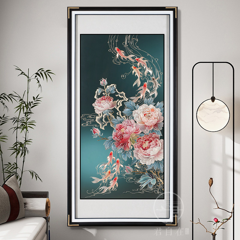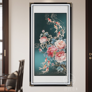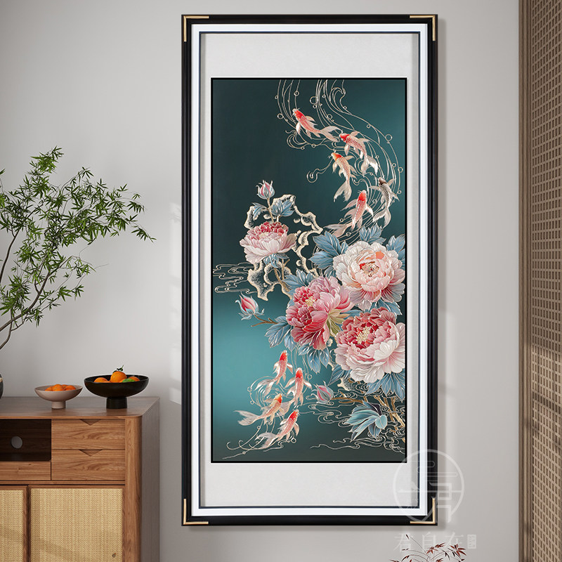 富贵有余2025新款 饰画玄关走廊入户墙招财九鱼图牡丹花 手工铜雕装