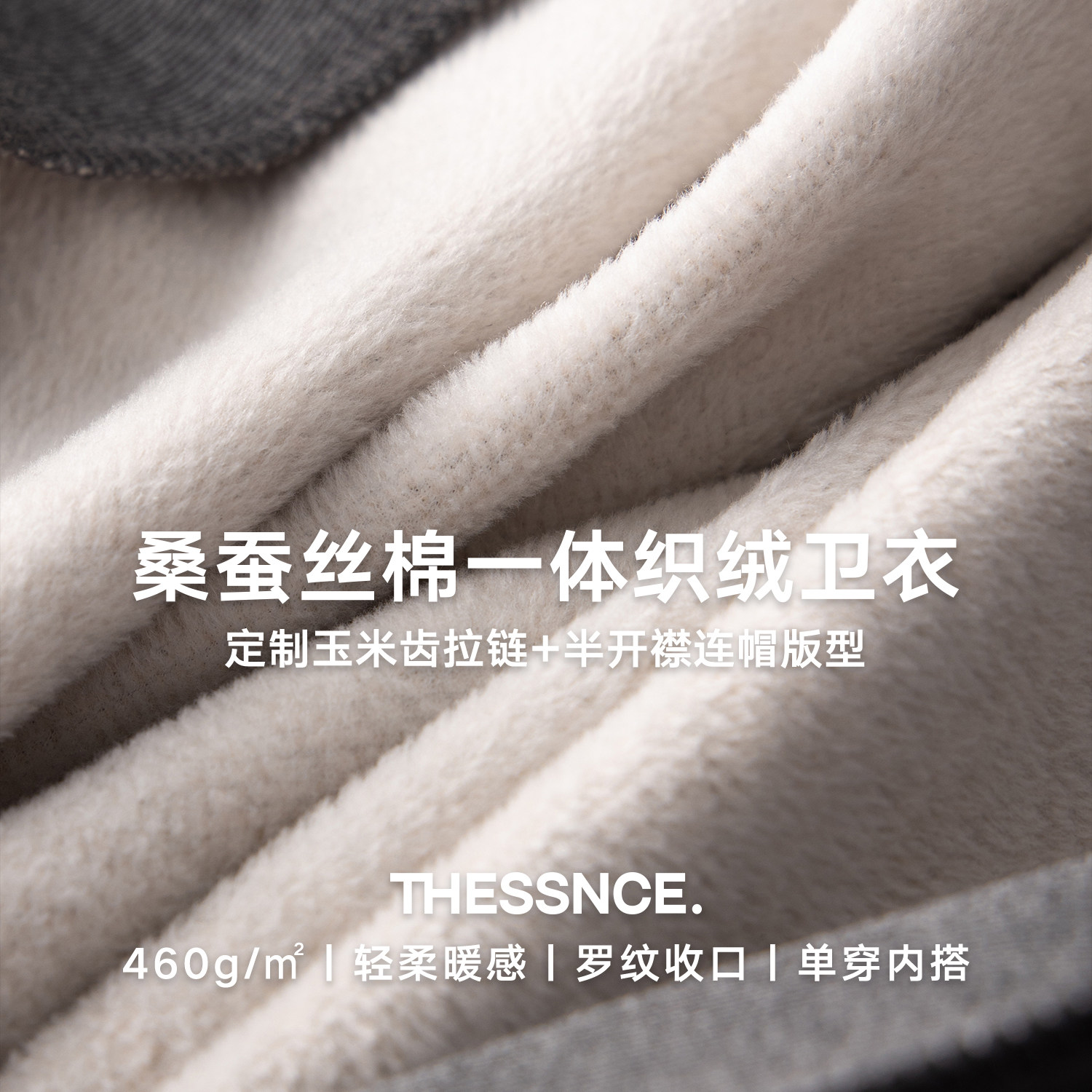 重磅约460g桑蚕丝棉纱混纺一体织绒针织连帽半开襟男士 卫衣 冬季