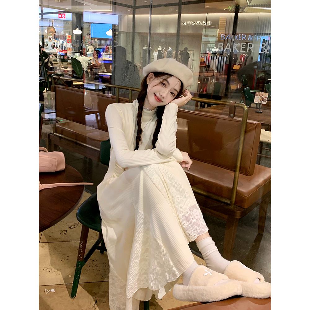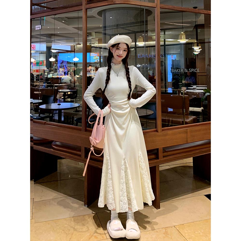 白色高领针织鱼尾连衣裙女秋冬配大衣内搭打底浅色毛衣长裙小个子