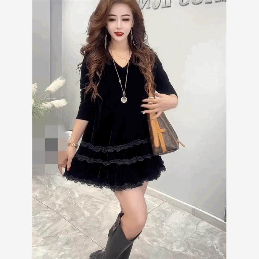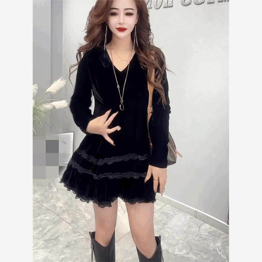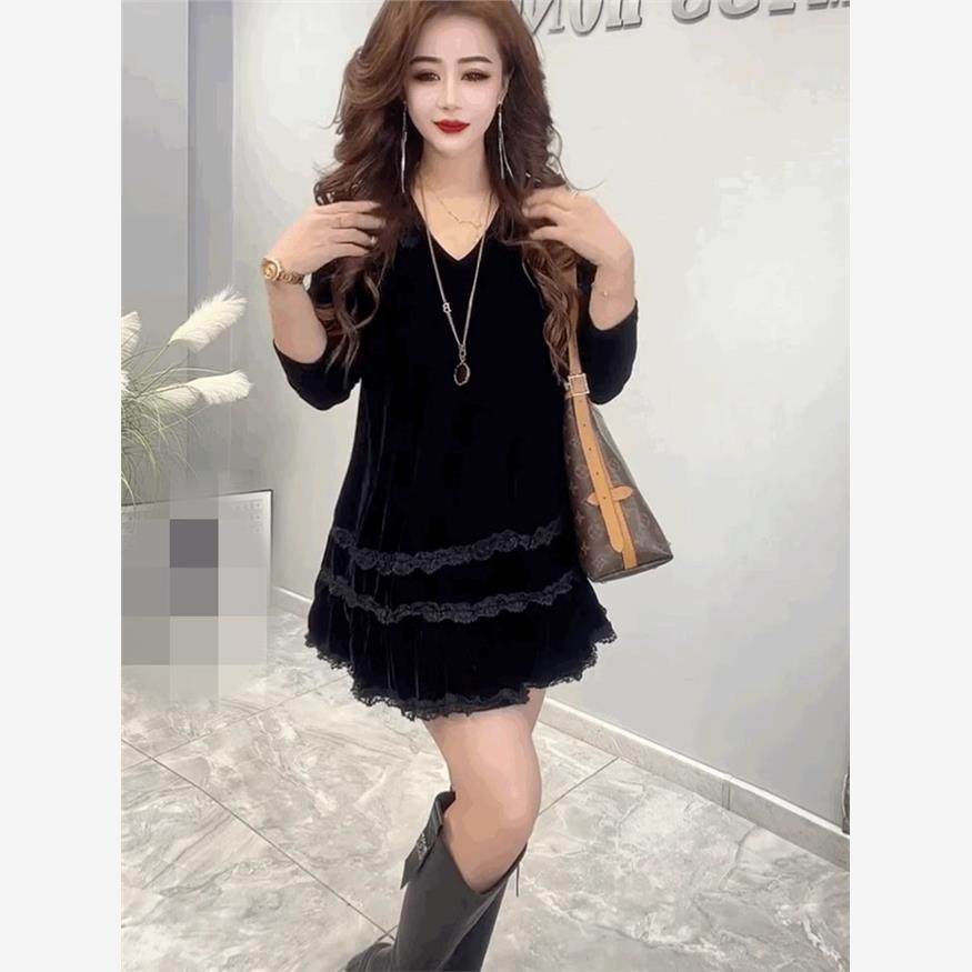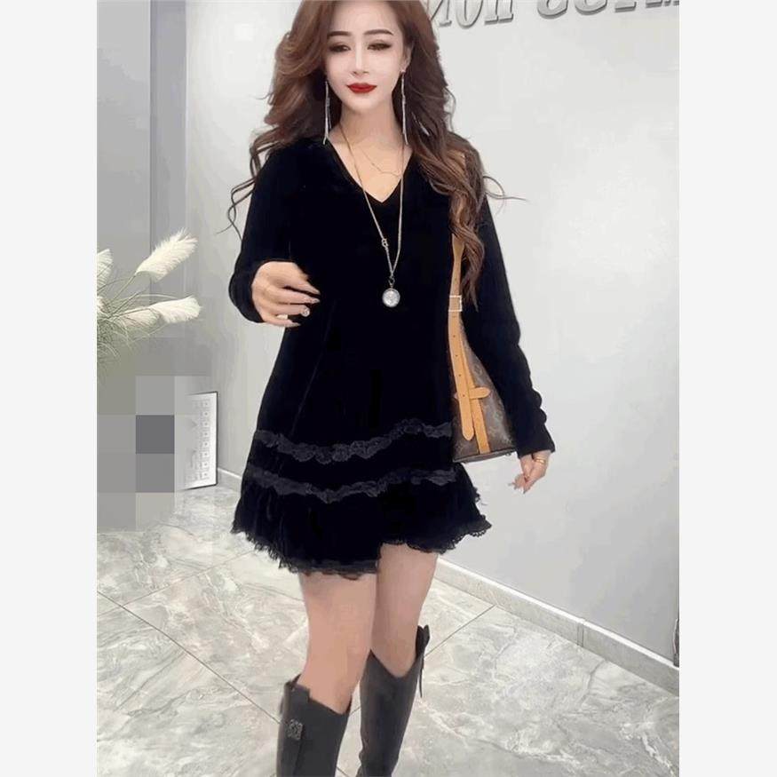 洋气蕾丝拼金丝绒V领连衣裙女黑色遮肉高级感荷叶边A字裙宽松裙子