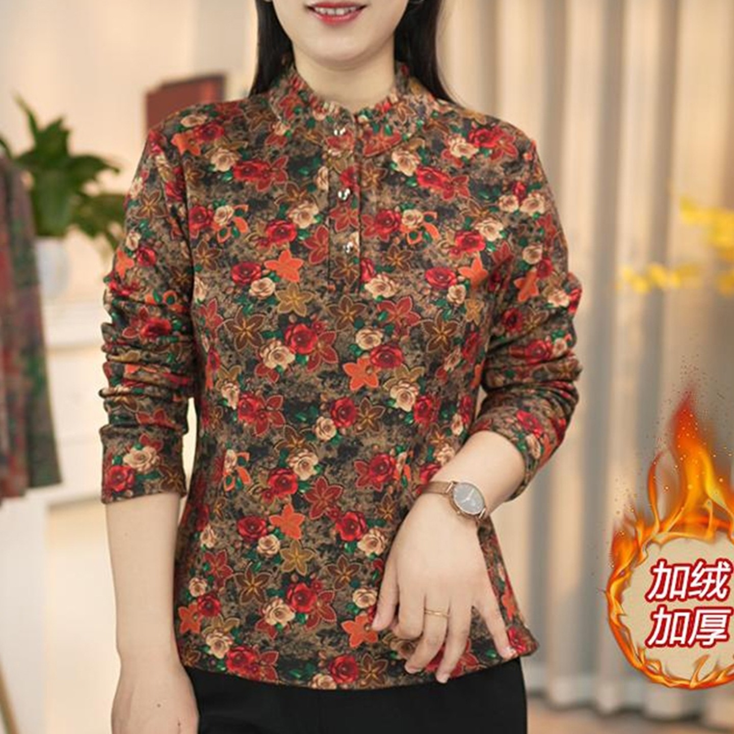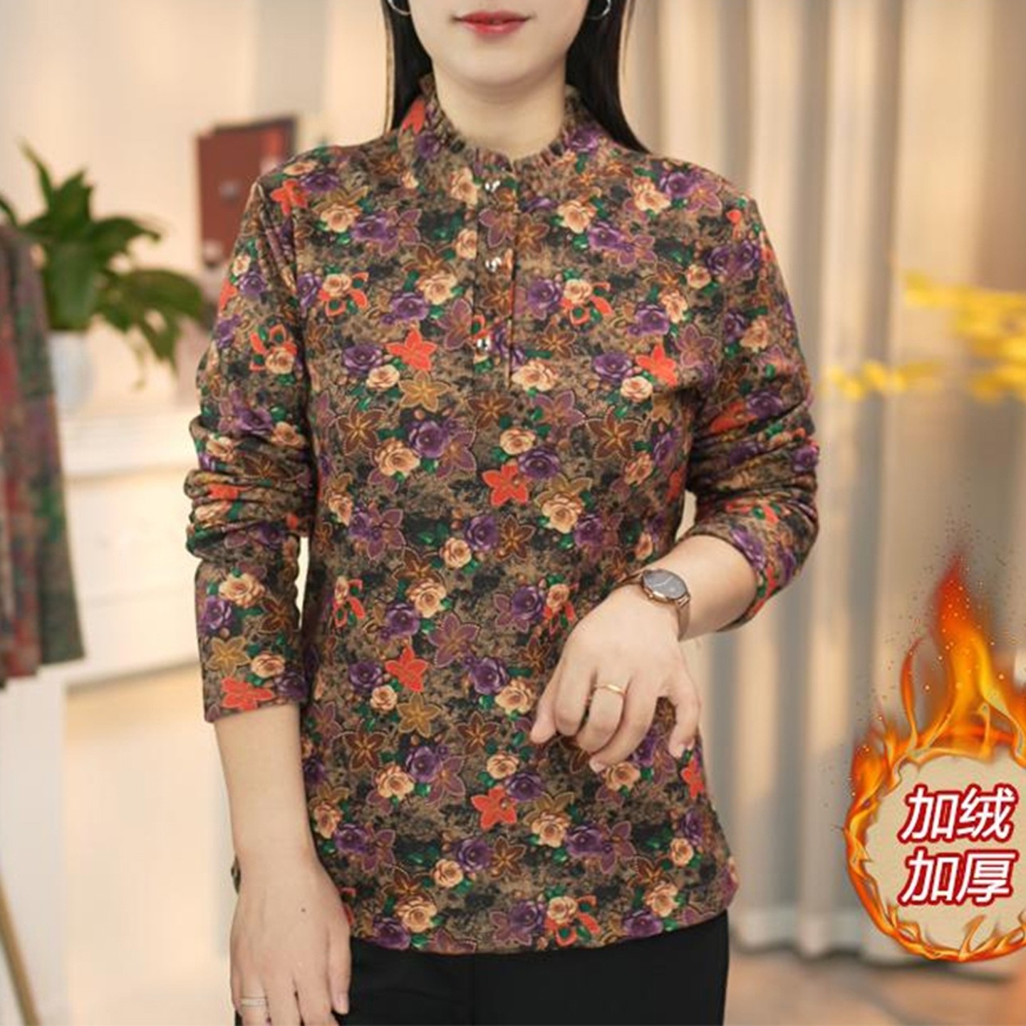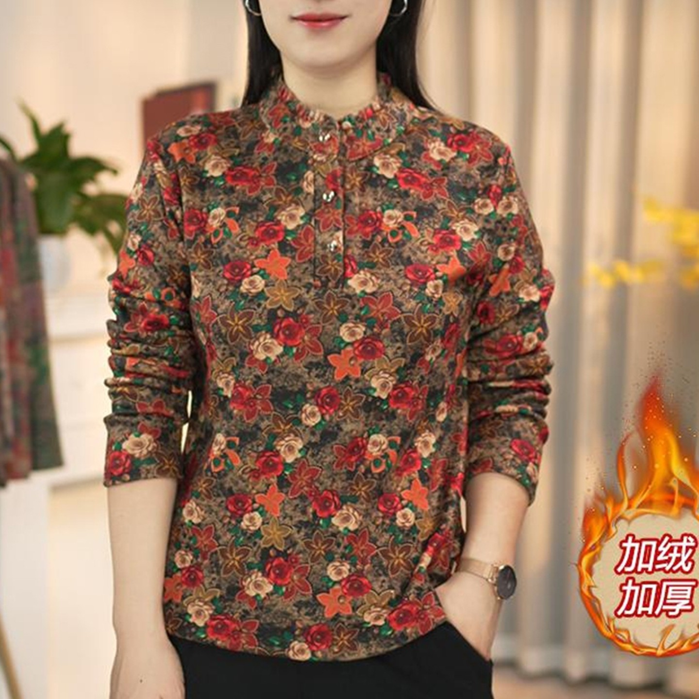 洋气双面绒小衫 妈妈秋冬季 木耳边保暖加绒印花上衣宽松新款 时尚