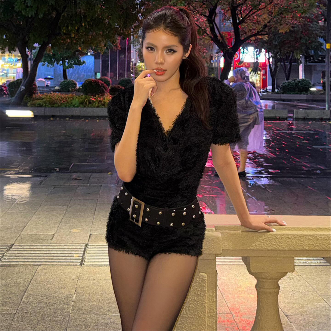 连体短裤 怪诞女孩 修身 秋冬短袖 氛围感辣妹黑色毛绒V领连体衣女