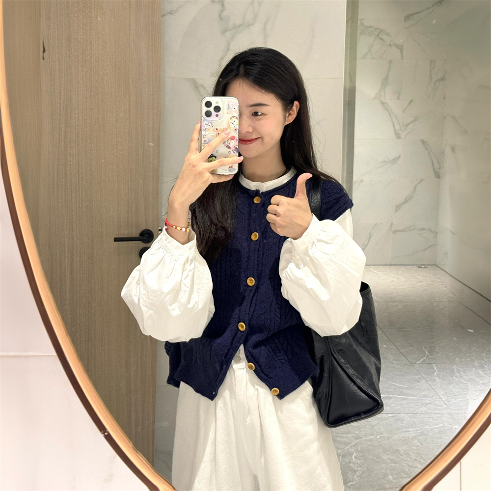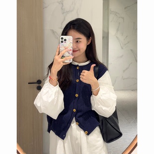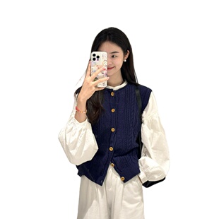 两件套装 韩版 衬衫 气质减龄麻花藏青毛衣背心针织马甲搭配长袖 时尚